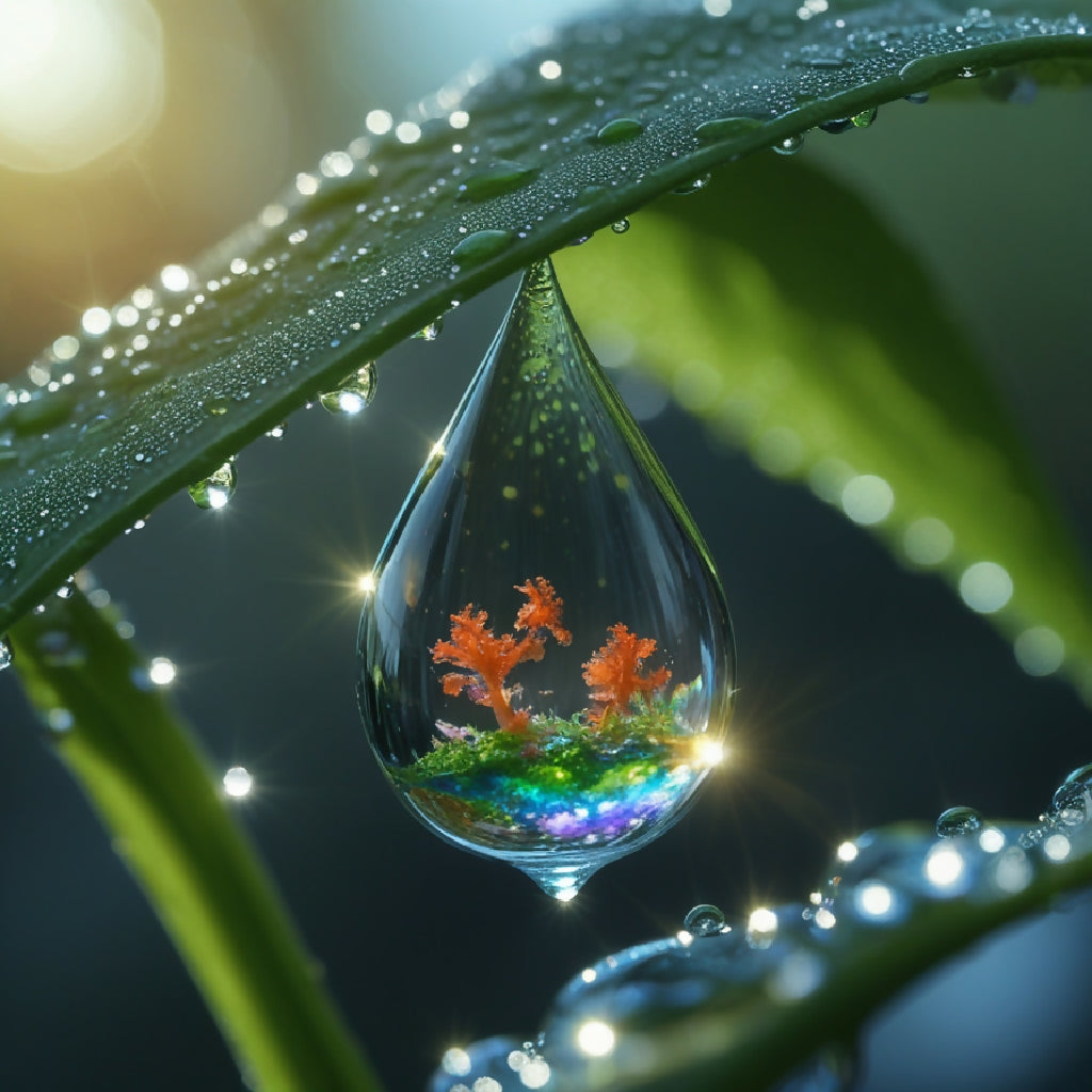 Experience the beauty of nature through stunning macro photography in this captivating scene. The camera begins with a close-up of a dew-covered leaf, gradually zooming in on a single droplet of water hanging delicately from its tip. As sunlight catches the droplet, an iridescent glow reveals a hidden, miniature ecosystem thriving within. The camera then transitions seamlessly inside the droplet, passing through its liquid membrane to immerse the viewer in an awe-inspiring micro-world. This breathtaking visual journey showcases the intricate details of nature, offering a mesmerizing look at the hidden life within a single drop of water. Perfect for lovers of macro photography and the wonders of the natural world.