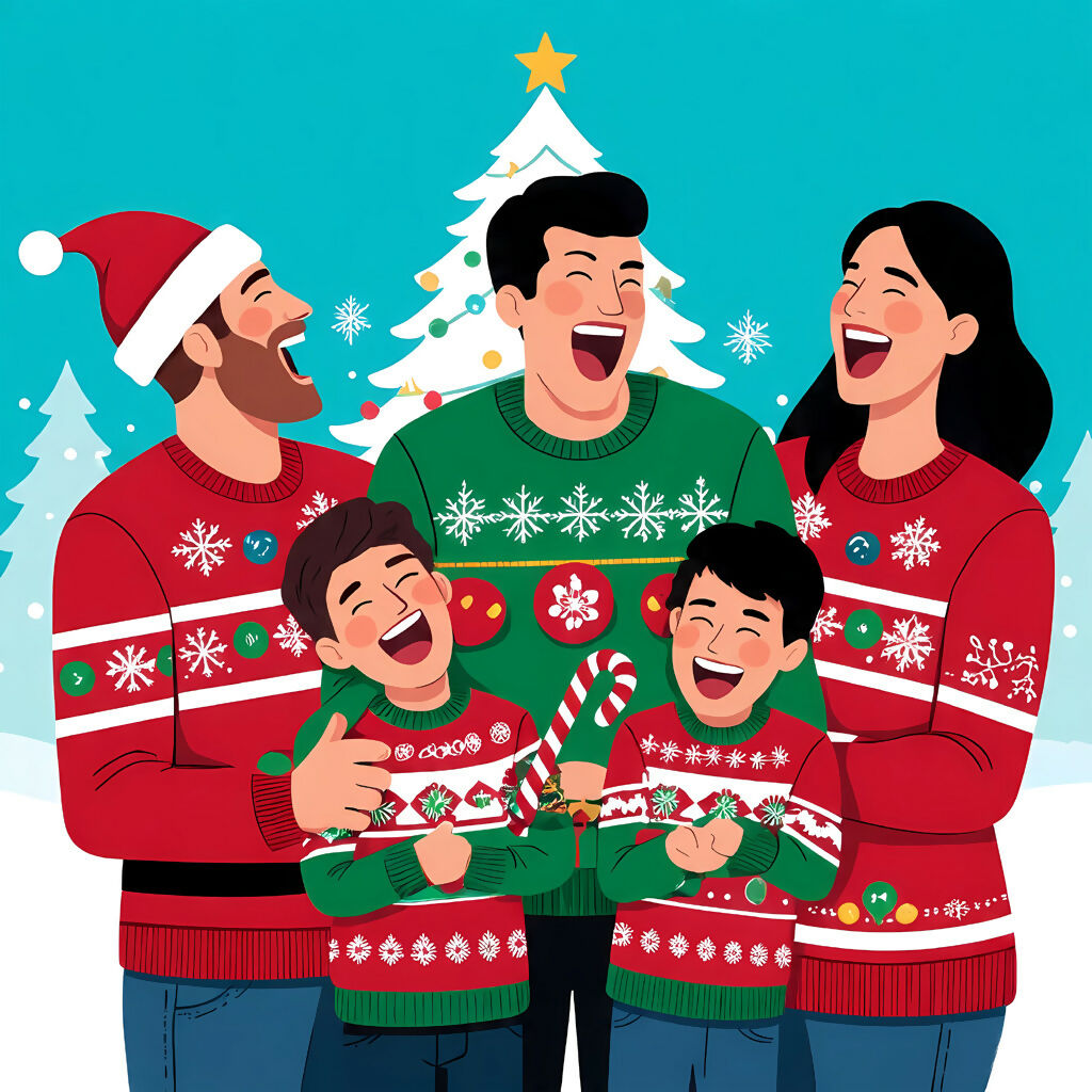 This heartwarming artwork portrays five cheerful friends standing before a beautifully decorated Christmas tree, its star shining brightly against a snowy forest backdrop. Each figure wears a colorful holiday sweater adorned with festive patterns, while one dons a Santa hat, adding playful charm. The laughter and warmth captured here tell a story of shared traditions, joy, and the magic of togetherness during the holiday season. It’s a celebration of community and the timeless spirit of Christmas, brought to life through AI artistry.