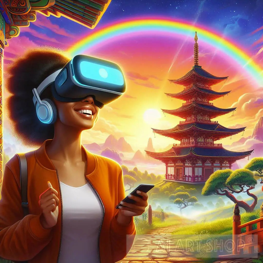 The scene unfolds in Shangri-La, a mythical and utopian setting, where the boundaries of reality are transcended. The vibrant digital rainbow that graces the landscape adds an extra layer of enchantment and signifies the kaleidoscope of experiences available through virtual reality.
