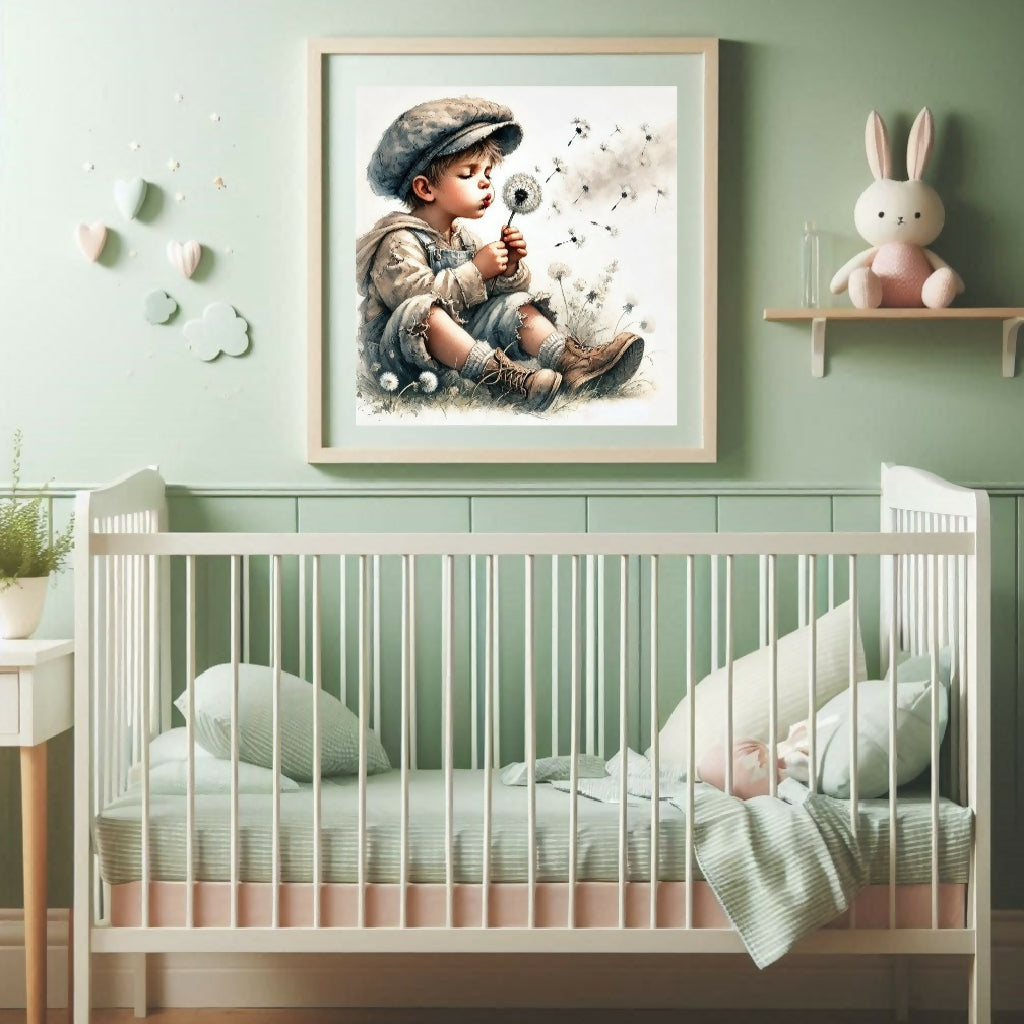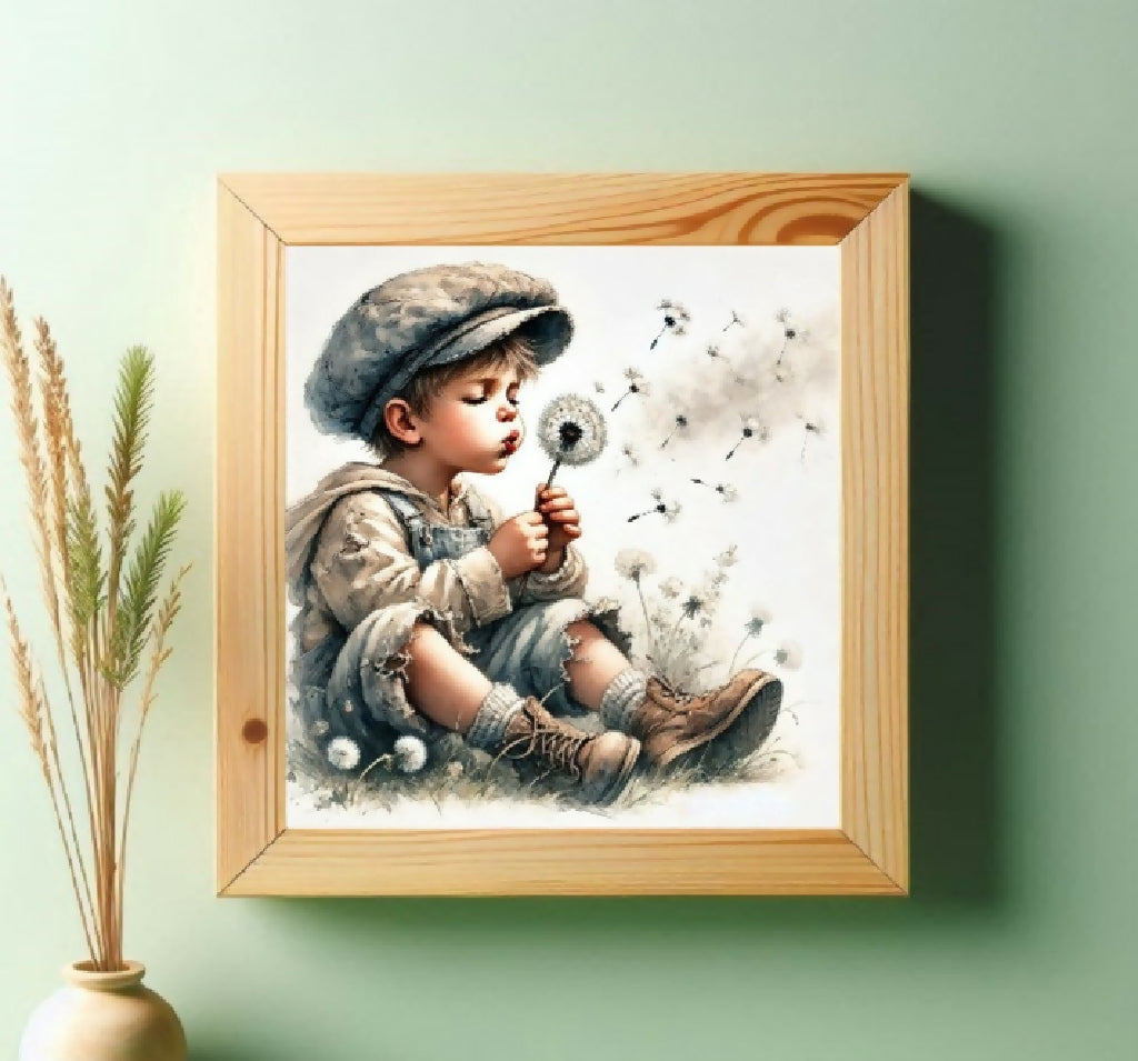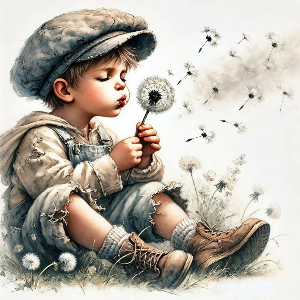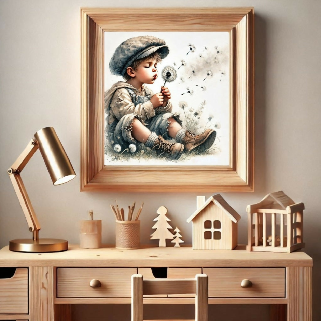 Ein nostalgisches Aquarellgemälde, das einen Jungen mit Pusteblume zeigt.