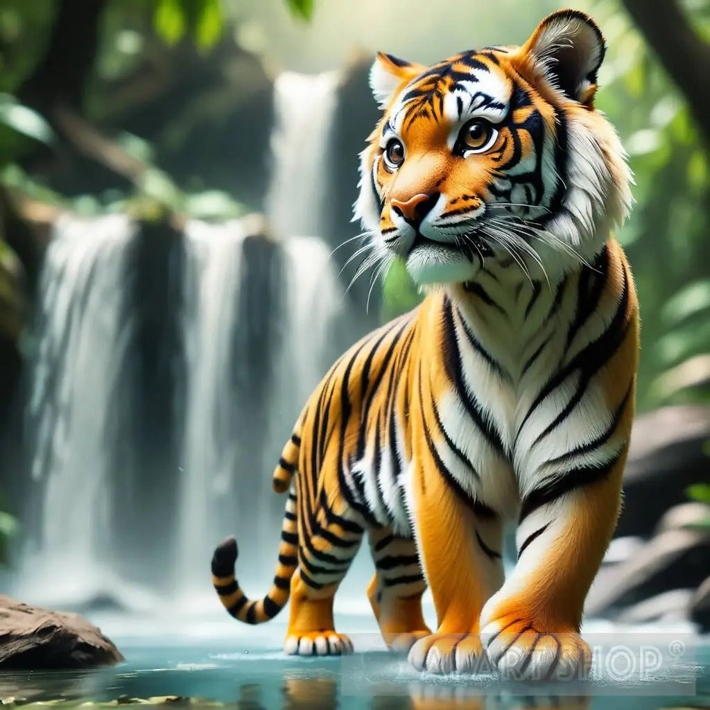 Deep within the verdant jungle, a playful tiger cub bounces with infectious energy. Sunlight filters through the thick canopy, dappling its orange and black fur as it chases fallen leaves. A majestic waterfall crashes in the background, mist spraying like diamonds through the air. The cub's paws dip into the refreshing pool beneath, sending ripples across the crystal-clear water, its reflection shimmering alongside the cascading flow. Witness the pure joy of a young predator in its natural paradise.