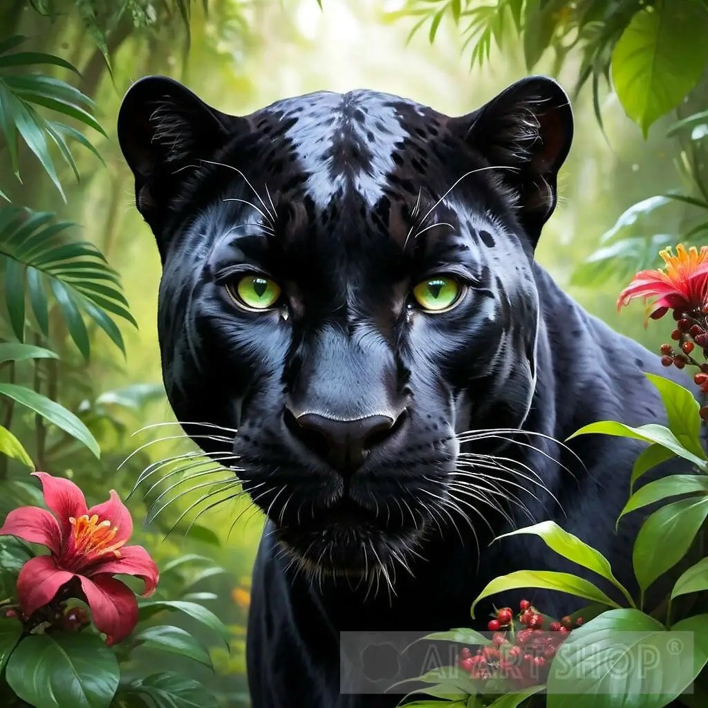 his captivating image showcases the magnificent black panther, a symbol of power and grace, as it prowls through its verdant domain. The panther’s emerald eyes pierce the jungle’s mystery, while the vivid foliage and floral accents highlight the untamed beauty of its natural habitat.