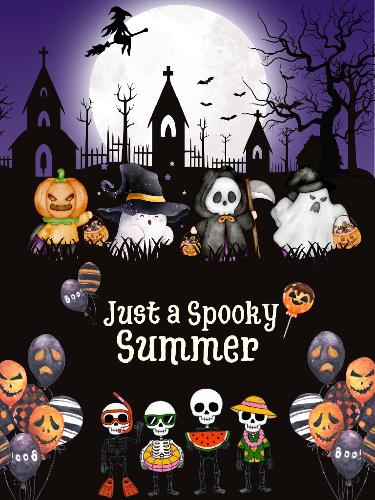 This vibrant Digital Download is perfectly designed for Halloween in July events, spooky beach parties, or any summer celebration that needs a ghostly touch. Featuring fun, retro illustrations of skeletons and ghosts relaxing on the sand, this graphic captures the essence of a Summer Halloween Bash.