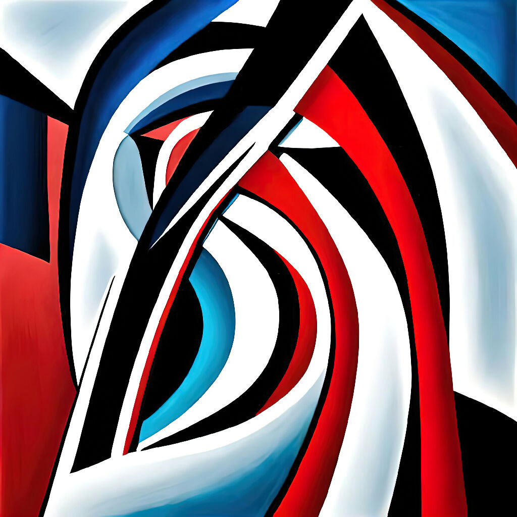 This abstract image features a striking kaleidoscope design defined by bold, geometric lines that radiate symmetrically from the center. The composition is a dynamic interplay of contrast and color, with sharp black outlines carving intricate, mirrored shapes against a crisp white background. Vivid accents of deep blue and vibrant red pulse through the image in angular bursts, creating a sense of motion and energy. The pattern is both hypnotic and structured, evoking the spontaneous rhythm of modern abstract art.