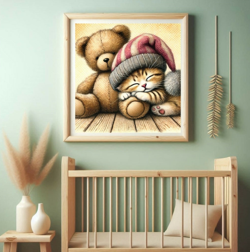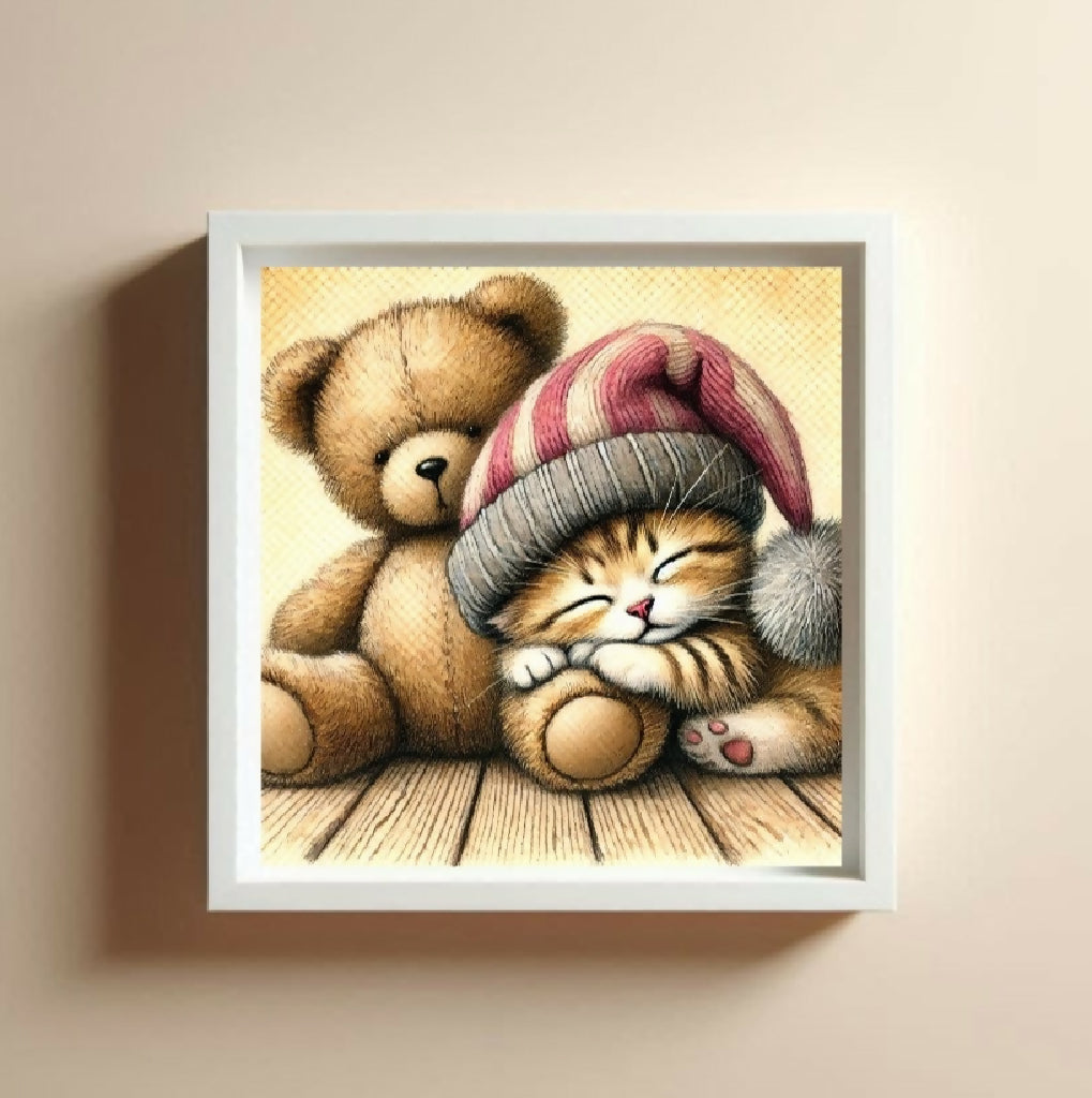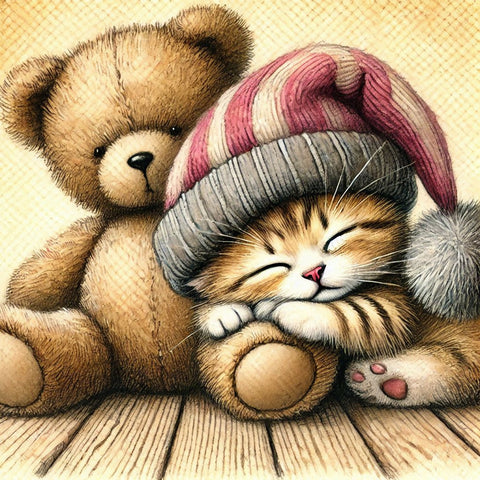 Aquarellgemälde einer schlafenden Katze mit Mütze neben einem Teddybären.