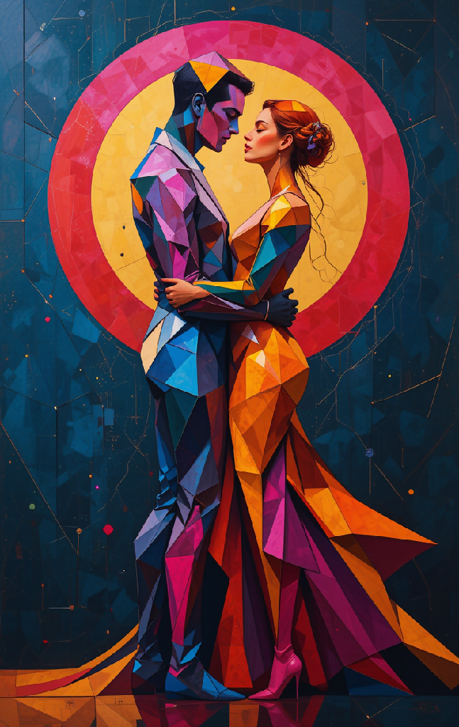 🔸 A colorful abstract art piece, showcasing a couple's kiss with geometric abstract kiss scene forms.