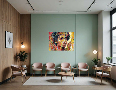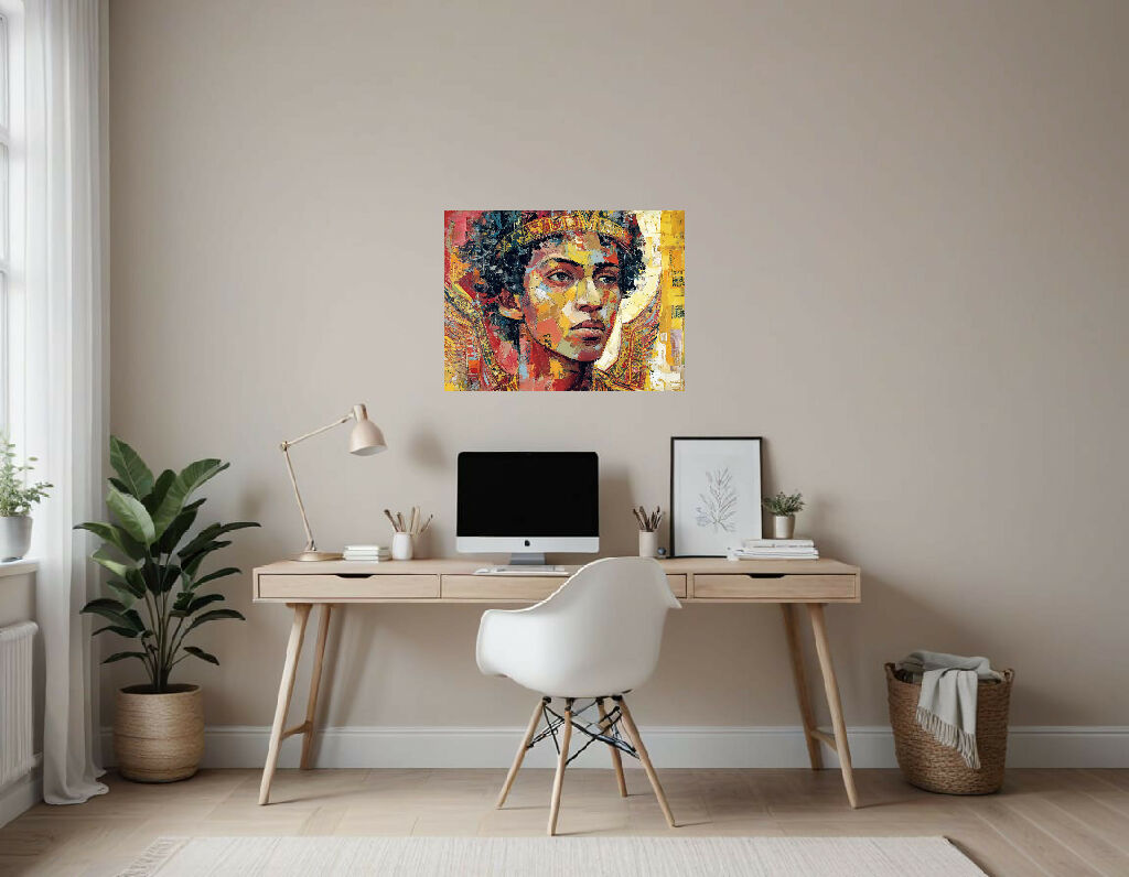 The background is a warm, golden yellow with subtle variations in texture and tone, creating depth and drawing the viewer's focus toward the central portrait. The overall style is expressive and modern, while referencing ancient Egyptian iconography. The artwork is an engaging blend of historical and contemporary artistic techniques.