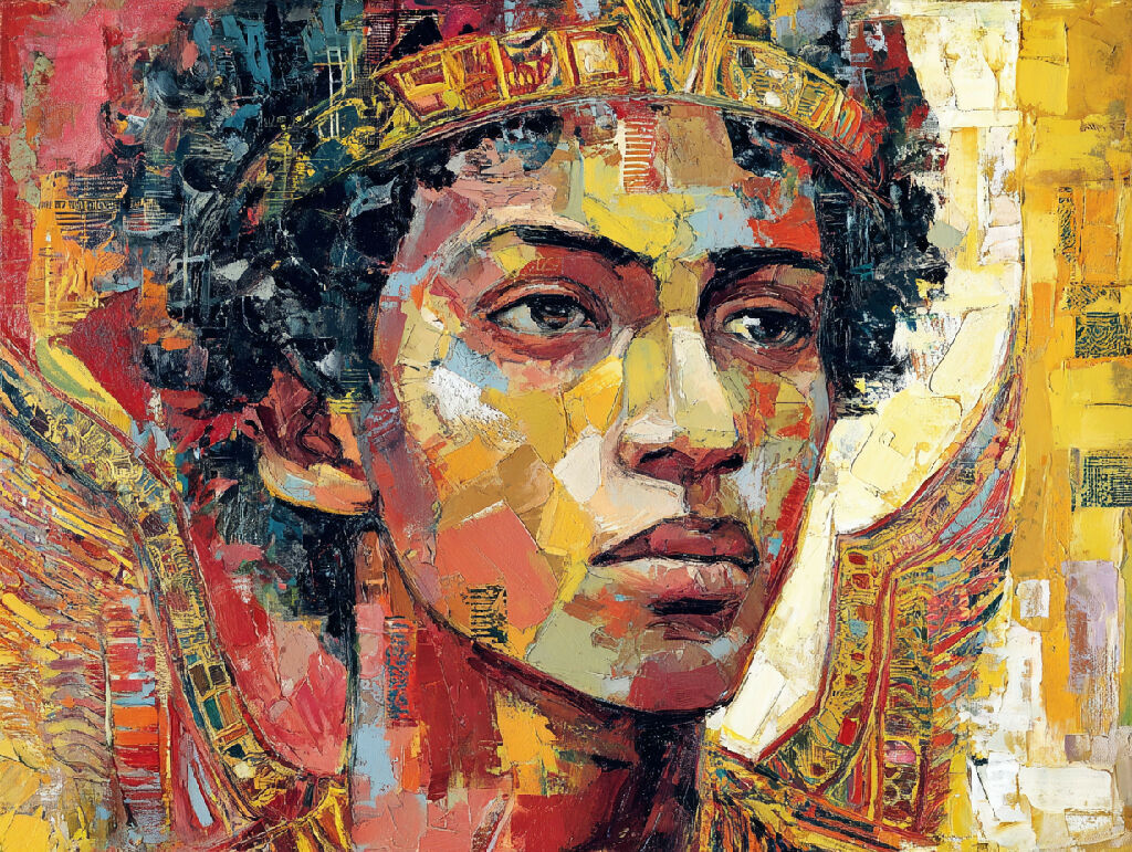 The painting is a vibrant and stylized portrait of King David. He is adorned with a golden crown, intricately detailed with geometric patterns and shapes.