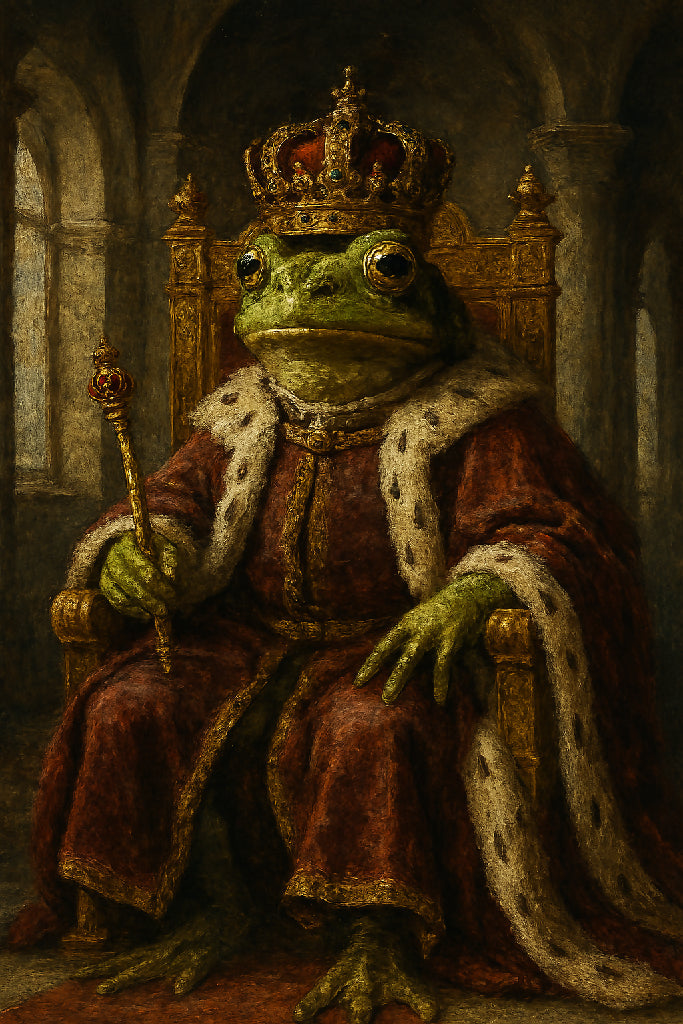 This digital artwork captures the majestic Frog King in the style of a classic 1800s painting, complete with textured brushstrokes, rich colors, and a regal pose that commands attention.