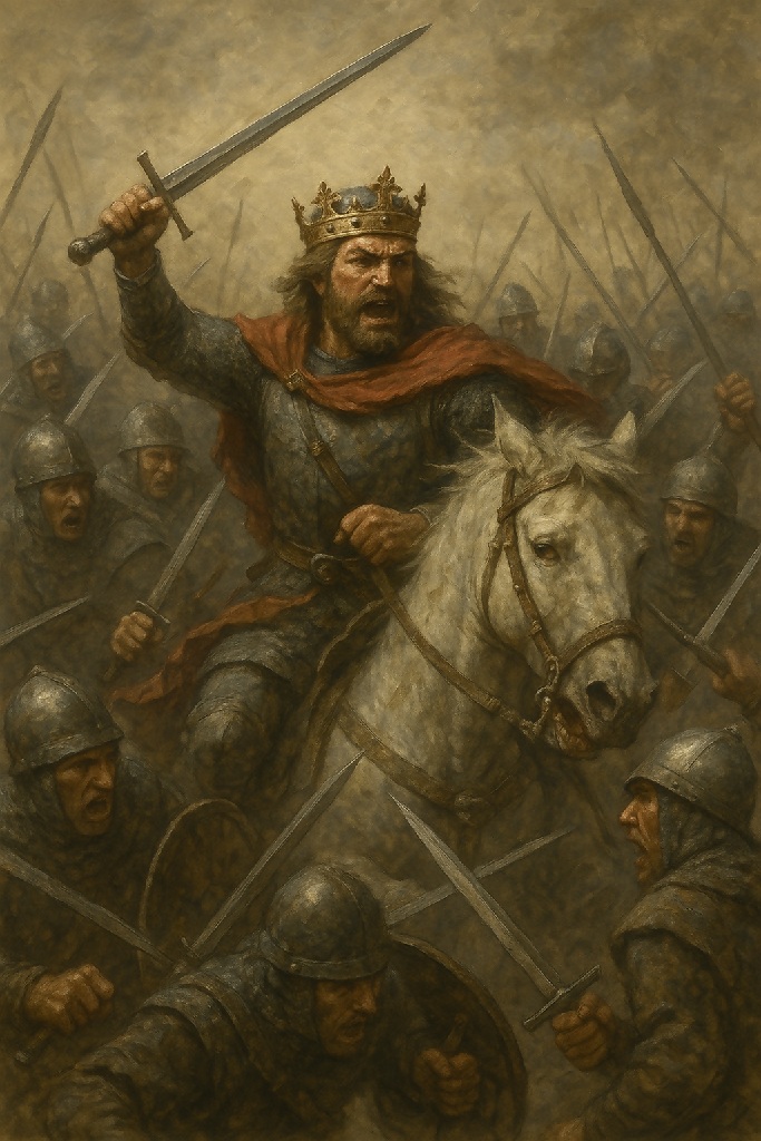 A brave king is seen riding a horse in the middle of a fierce battle. He holds a sword in one hand, leading his army with strength and determination. The battlefield is filled with soldiers, dust, and chaos, capturing the intensity and courage of war.