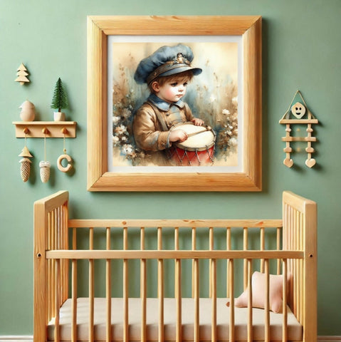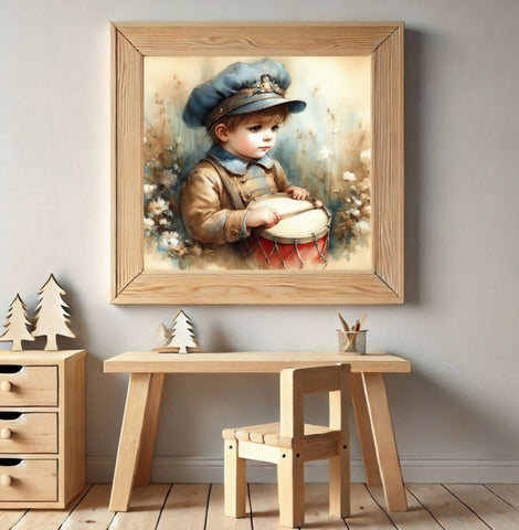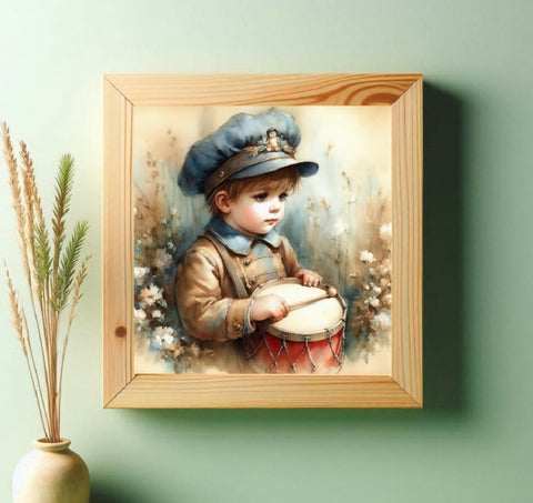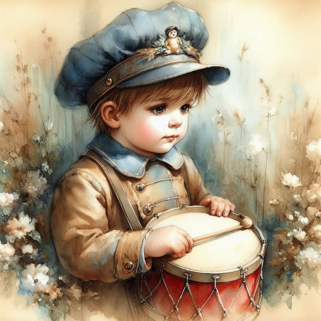 Ein nostalgisches Aquarellgemälde eines Jungen mit Trommel.