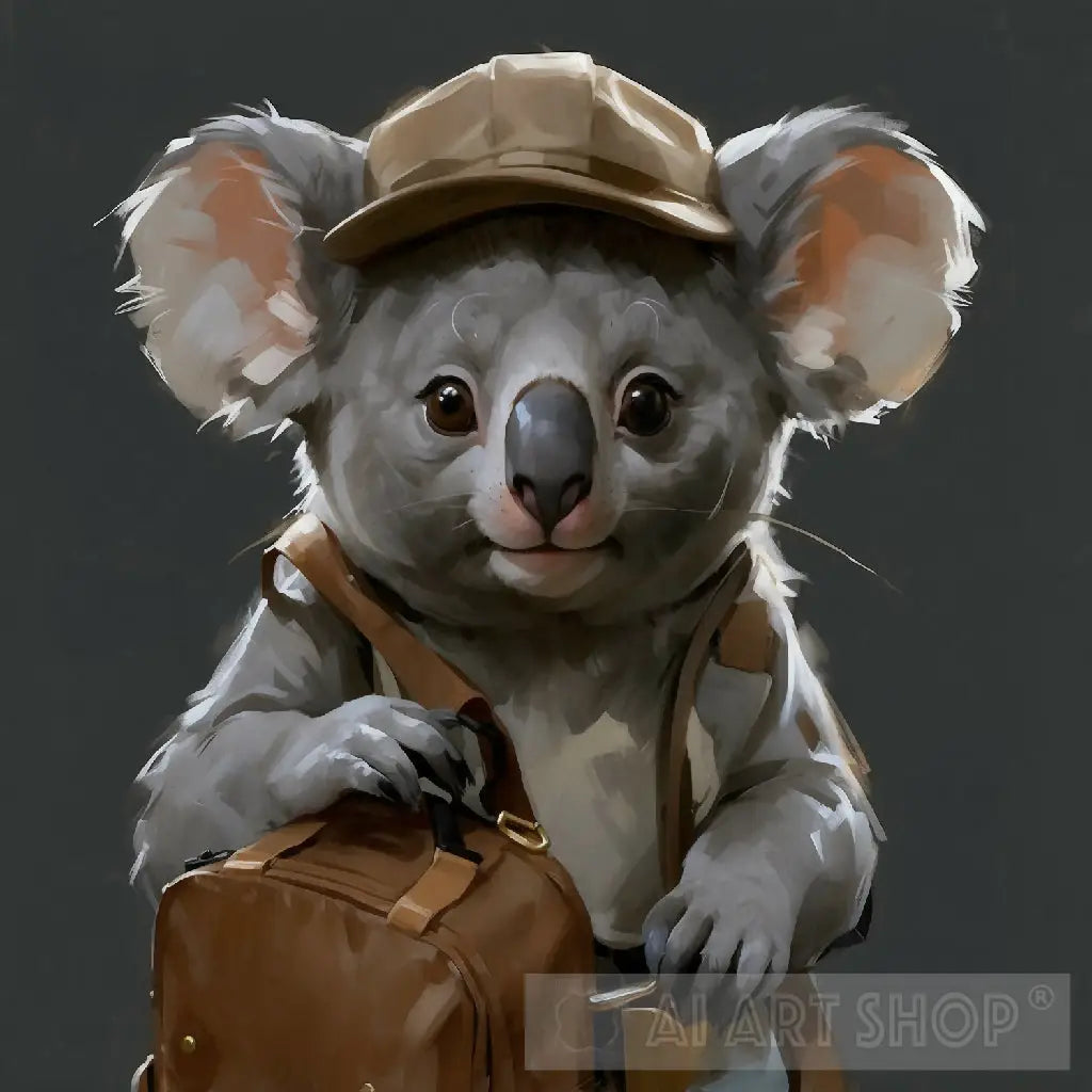 Koala wearing a beige detective gabardine Sherlock Holmes’s hat,carrying a backpack, for character development,realistic but stylised illustration,graffiti art elements of style,multiple angles