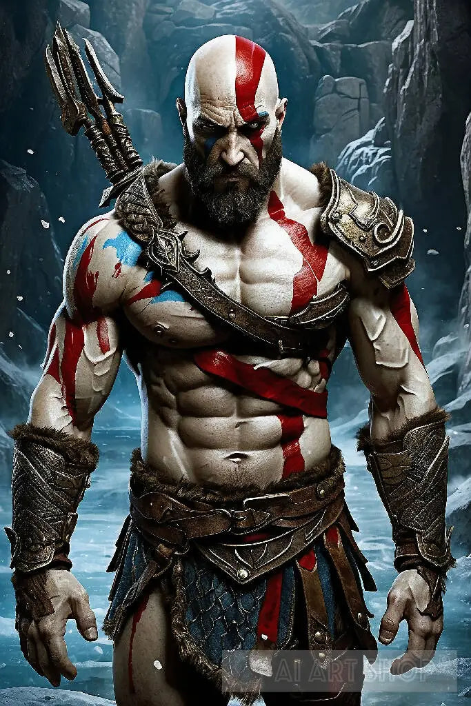 Kratos, the iconic protagonist from the popular video game God of War, stands in a fierce battle stance, wielding his blades in a posture exuding preparedness for the forthcoming war. With a visible scar marring his eye and abdomen, the viewer is reminded of the battles he has endured. This astounding image, whether in the form of a highly detailed painting or a stunning photograph, captures every minute detail, showcasing the impeccable craftsmanship and artistic prowess that went into its creation. The viewer is captivated by the intricate depiction of Kratos, with his bulging muscles, veins and determined frustrated expression, as if time stands still in this frozen moment of sheer heroism.