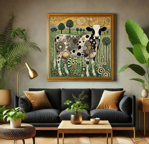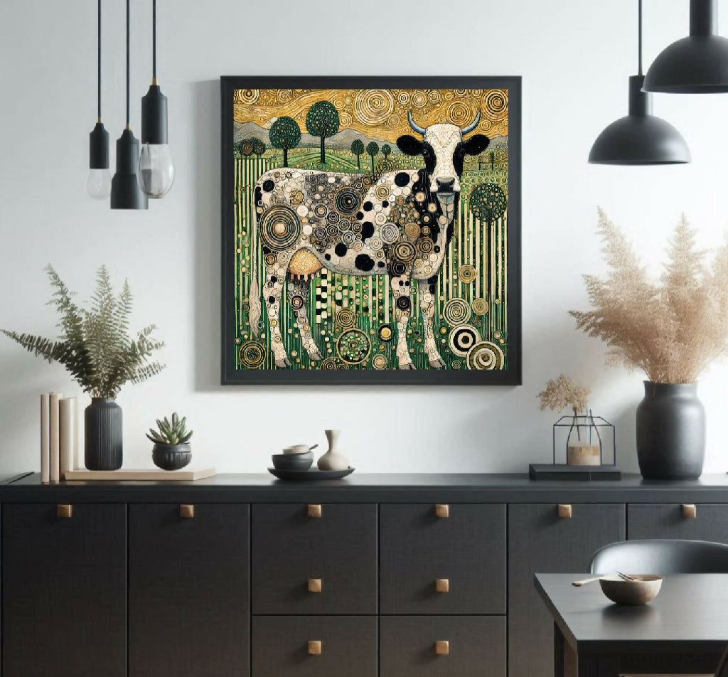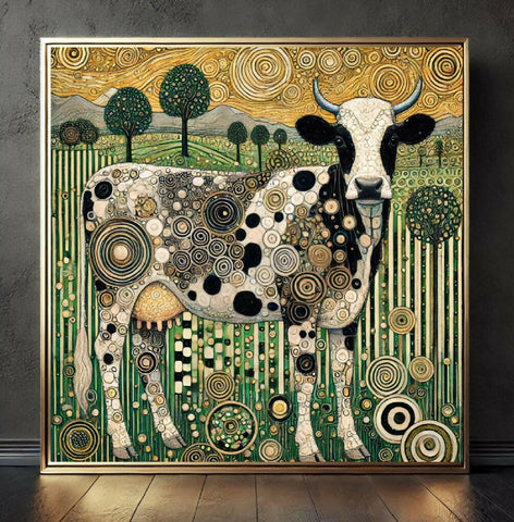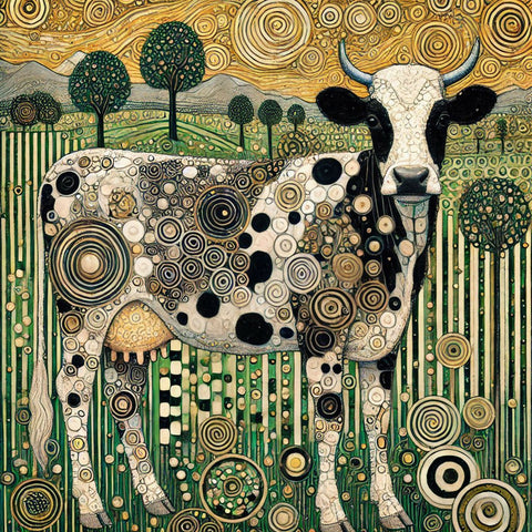 Eine schwarz-weiß gefleckte Kuh, aber die Flecken sind nicht einfach, sondern bestehen aus konzentrischen Kreisen in verschiedenen Grüntönen, Goldtönen und Schwarz. Auch die Landschaft ist stilisiert, mit vertikalen, gestreiften Bäumen, konzentrischen Kreisen, die das Gras darstellen, und einem goldenen, abstrakten Hintergrund. Der Stil ist eher abstrakt und erinnert an naive Kunst oder Art Deco.
