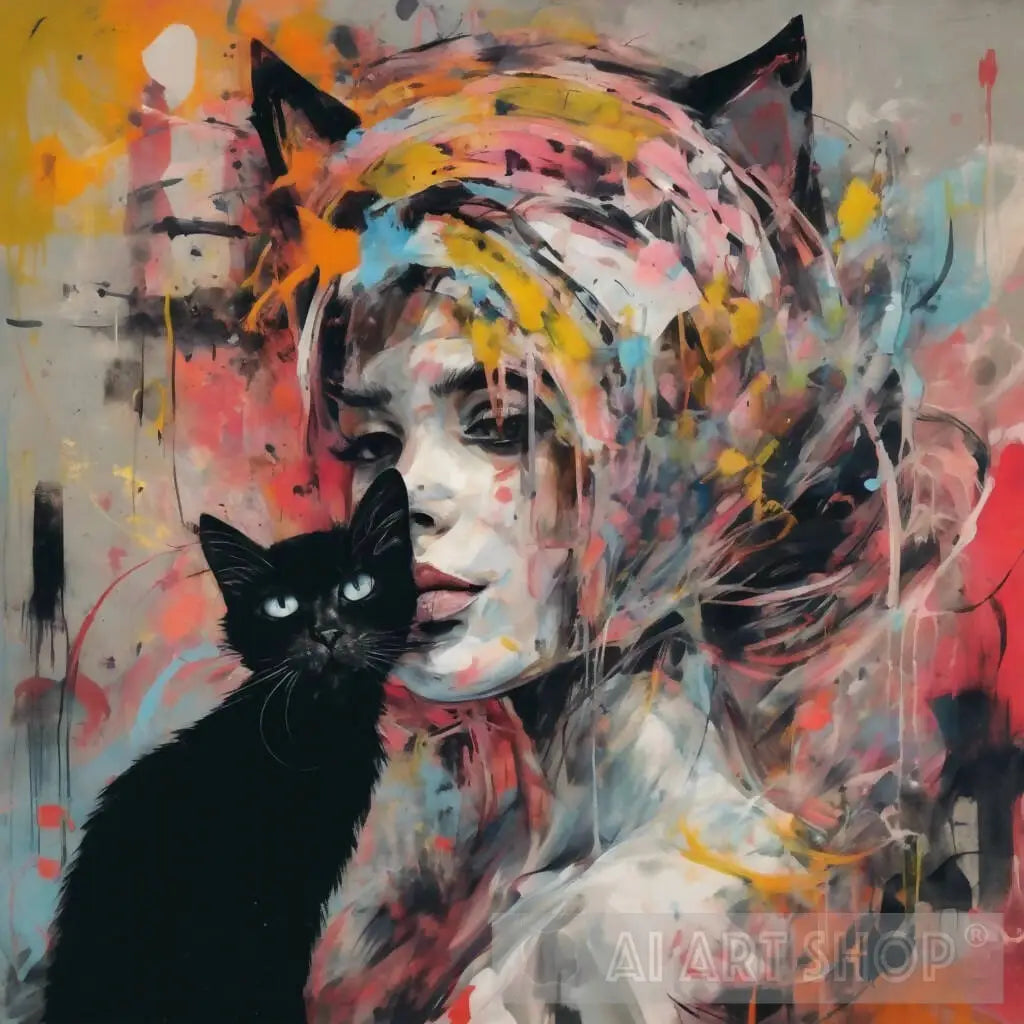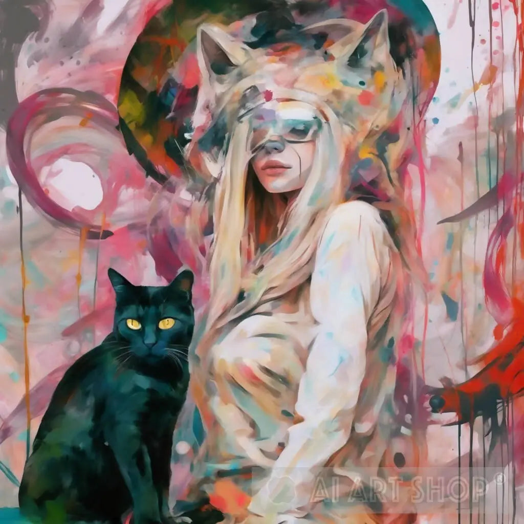 Femininity merges with the mystique of feline grace. A mesmerizing abstract beauty. Vibrant colors swirl around the figures, An aura of magic, allure and dynamic energy. Poised next to her feline counterpart, their connection shrouded in secrecy and intrigue. 'La Femme Chatte' invites viewers to explore the depths of feminine mystique and the timeless bond between women and cats.