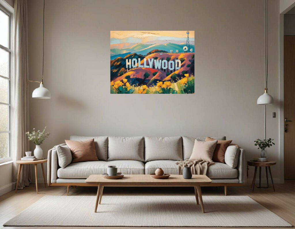 This is a vibrant, stylized painting of the iconic Hollywood sign, set against a picturesque backdrop of rolling hills and a serene sky. The artwork employs a textured, impasto style with bold, expressive brushstrokes that add depth and movement to the scene.