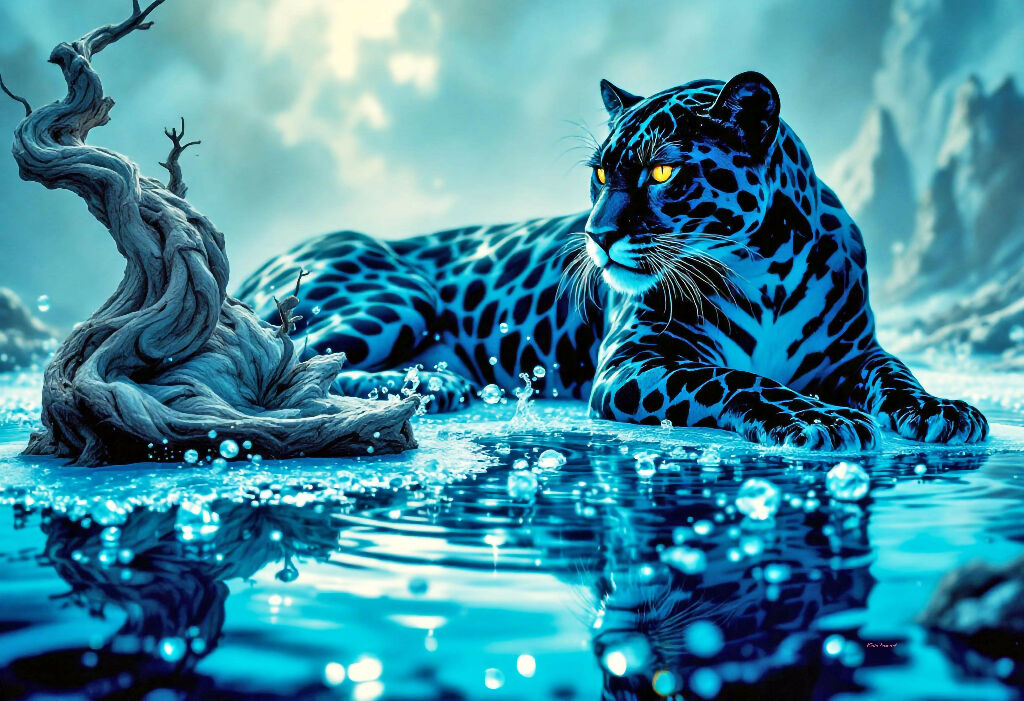 Un jaguar bleu fantastique se repose dans un paysage aquatique onirique.