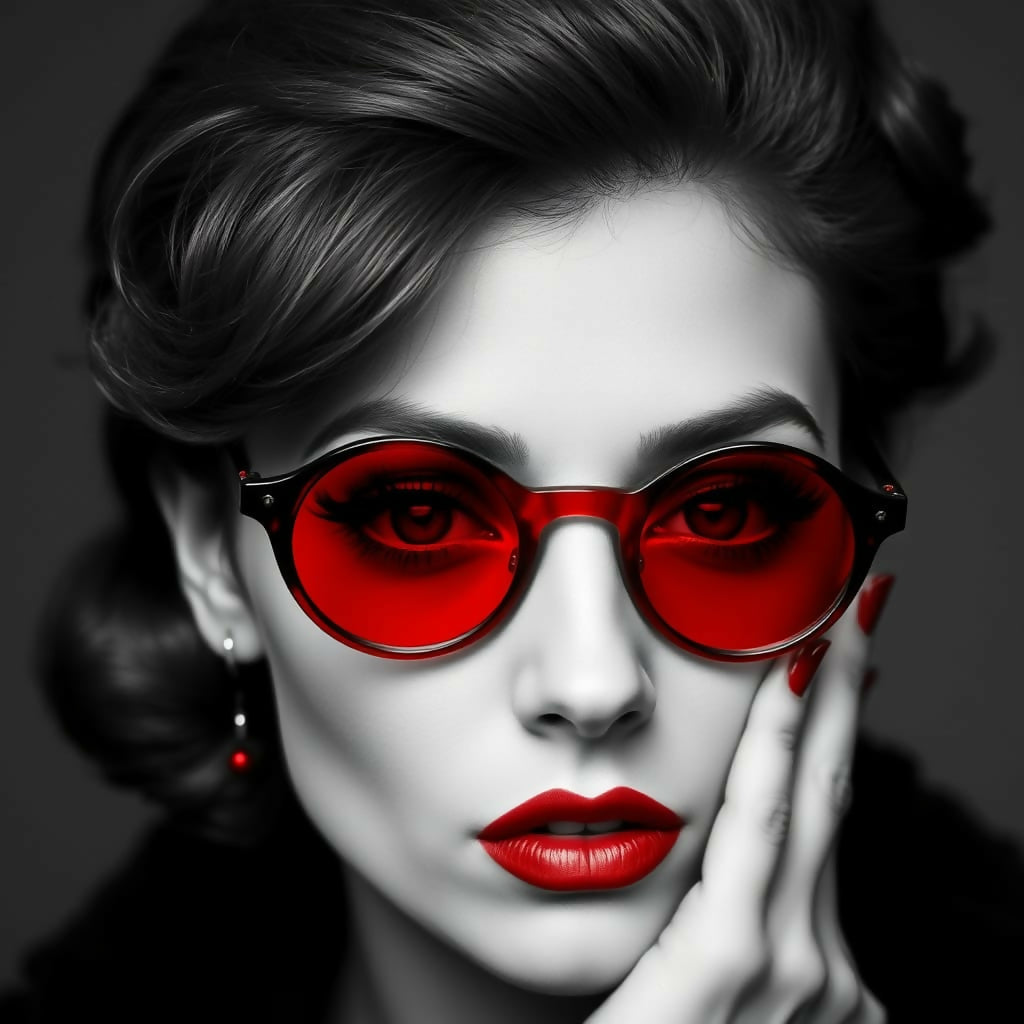 Portrait de femme en noir et blanc avec des lunettes et des lèvres rouges