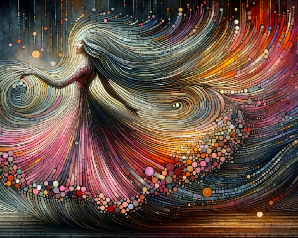 A vibrant, abstract painting depicting a woman's profile with flowing hair resembling a cosmic wave, merging colors and dots in a dynamic swirl.