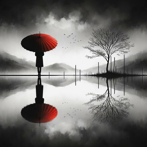 A solitary figure holding a red umbrella stands beside a leafless tree, reflected in water under a misty, monochrome sky.