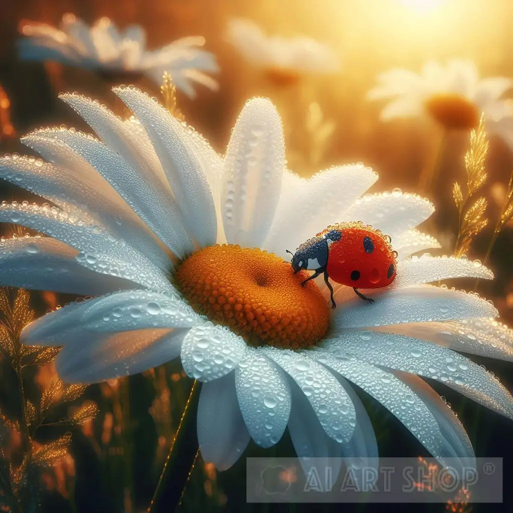 A view of a ladybug on a white Daisy flower with water drops in the warm morning light. Raw photo, close-up photo.