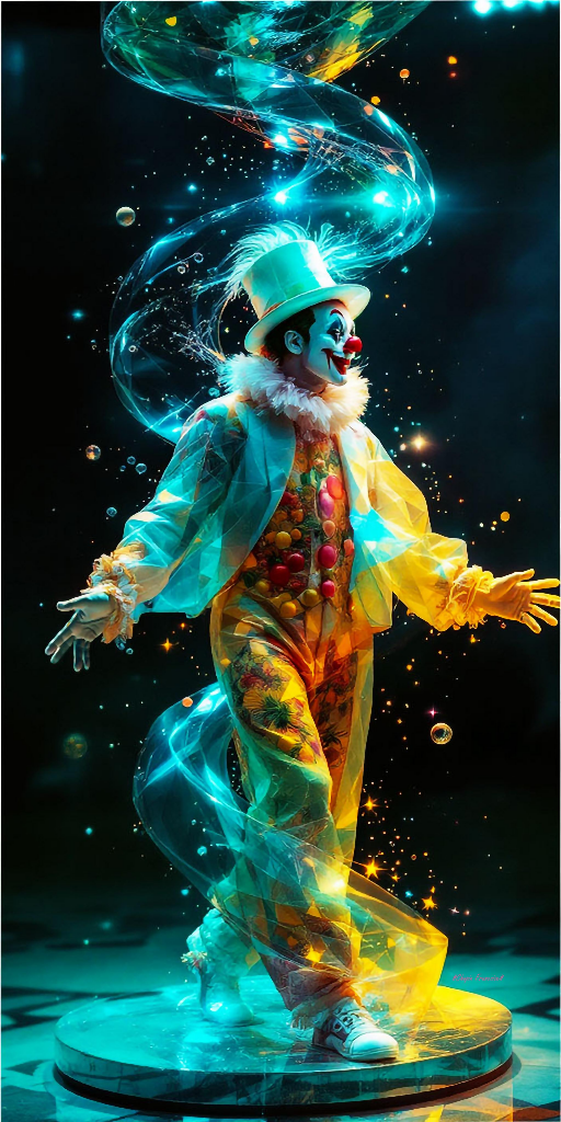 Un tourbillon de lumière turquoise et jaune encercle le clown, partant du haut de son chapeau et se prolongeant jusqu'à ses pieds. Ce tourbillon est composé d'énergie et de magie, créant un effet visuel dynamique et captivant. Le clown se tient sur une plateforme circulaire qui reflète la lumière ambiante, donnant l'impression qu'il est au centre d'une scène ou d'un spectacle.