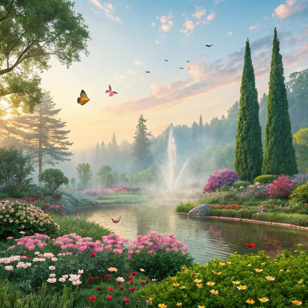 A serene, picturesque landscape unfolds at dawn. A tranquil lake, reflecting the soft morning light, winds through a meticulously maintained garden.