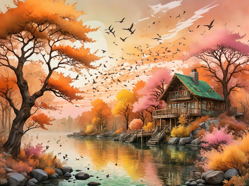 Waterpaint art , peaceful house by the lake and surrounded by trees and birds.