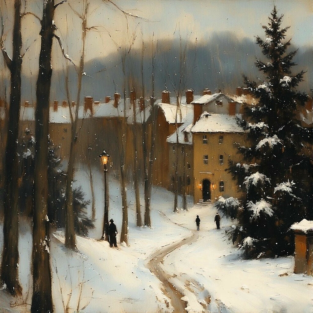 This Ai landscape painting depicts a serene winter scene, at dusk as soft snow gently falls. A winding, snow-covered path leads through a landscape dotted with bare trees and a prominent, snow-laden evergreen on the right. In the background, warm lights emanate from the windows and doorways of snow-capped buildings, creating a sense of cozy refuge.