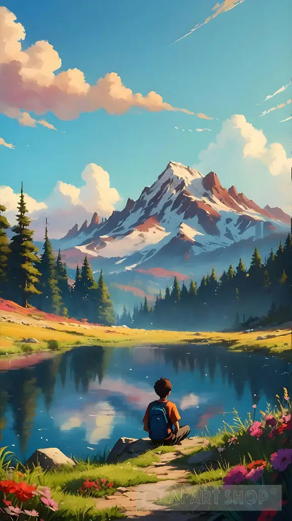 Illustrate a serene peaceful nature scene in summer. This scene inspires peace, awe, and tranquility. Vivid beautiful colors. photorealistic 8k, mountain, add 18 year old boy