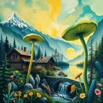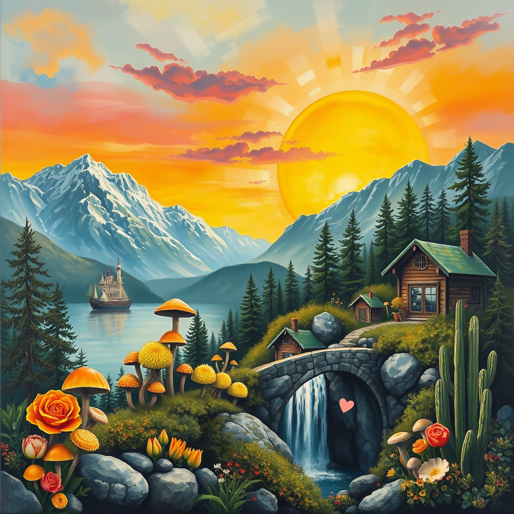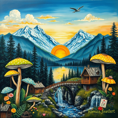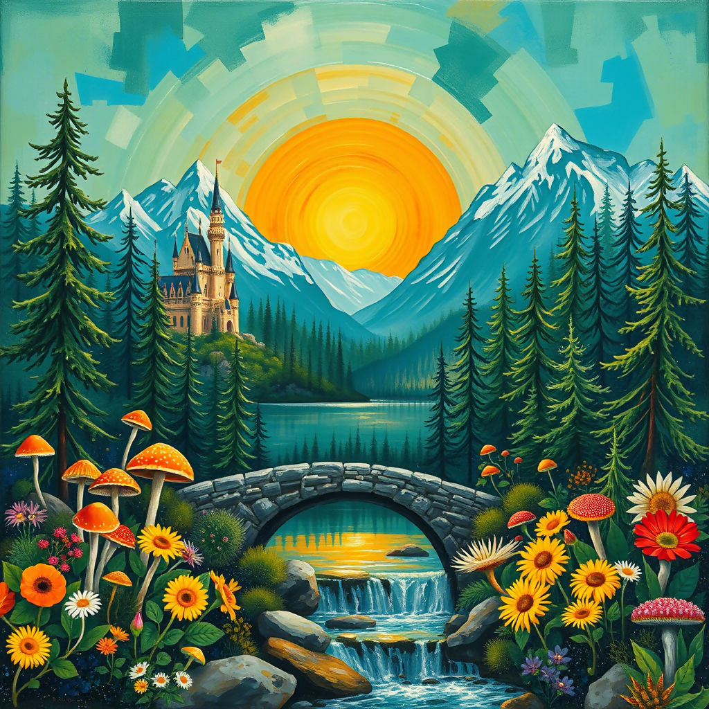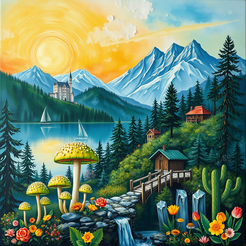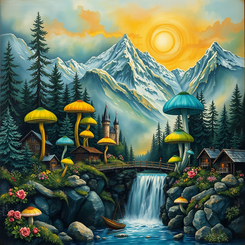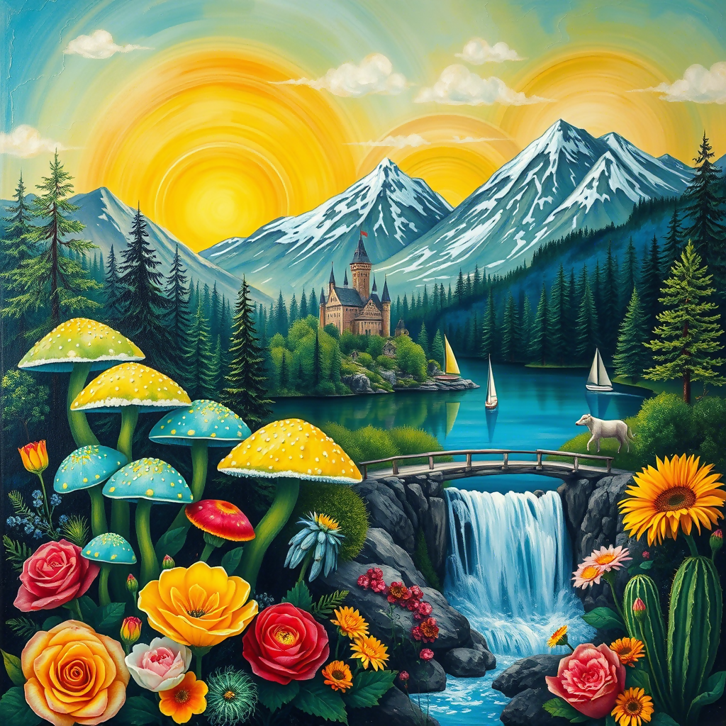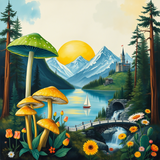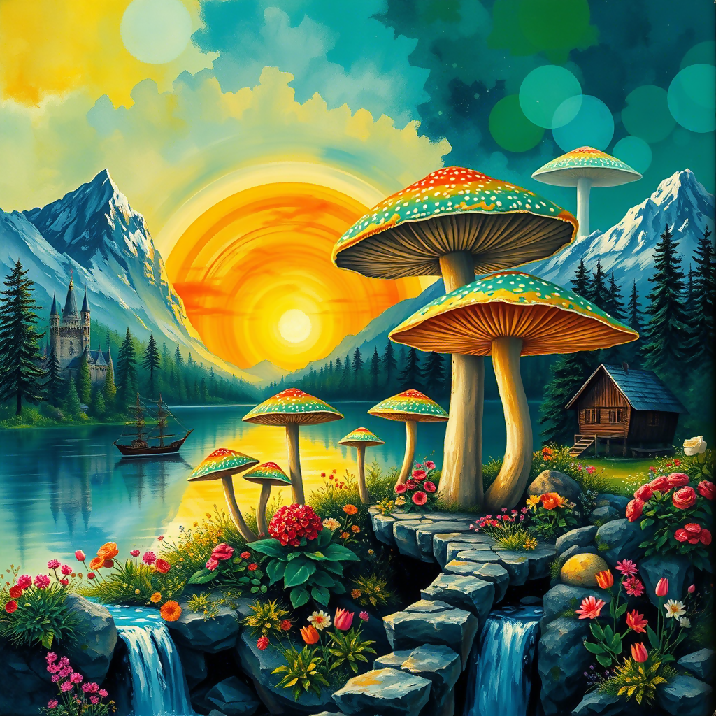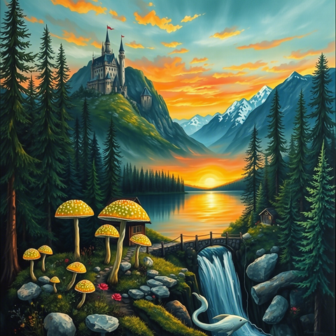 A vibrant digital painting depicting a whimsical landscape with a majestic castle perched on a mountain overlooking a serene lake. In the foreground, several large, yellow-spotted mushrooms add a touch of fantasy. A waterfall flows into the lake, and snow-capped mountains are visible in the distance under a colorful sunset sky.