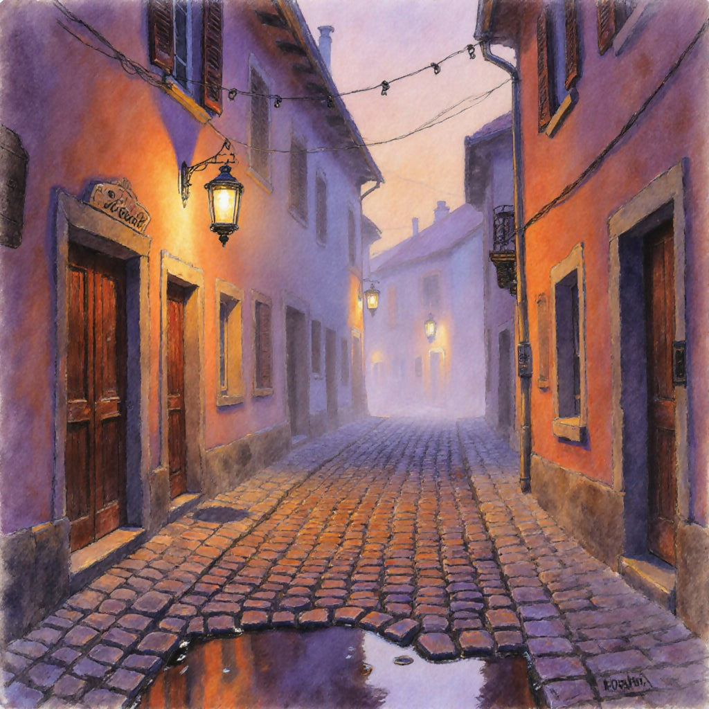 Lanterns in the Mist captures the timeless charm of a village street at twilight, brought to life through the delicate textures of colored pencil artistry. Warm lantern light cuts gently through drifting mist, illuminating cobblestones, puddles, and rustic wooden doors in soft oranges and purples. The hand-drawn aesthetic adds intimacy, evoking the quiet wonder of wandering through a world where serenity still lingers. This is not just an image but a one-of-a-kind collector’s edition — a singular artwork that embodies hygge calm and contemplative beauty. Once claimed, no other will ever exist.