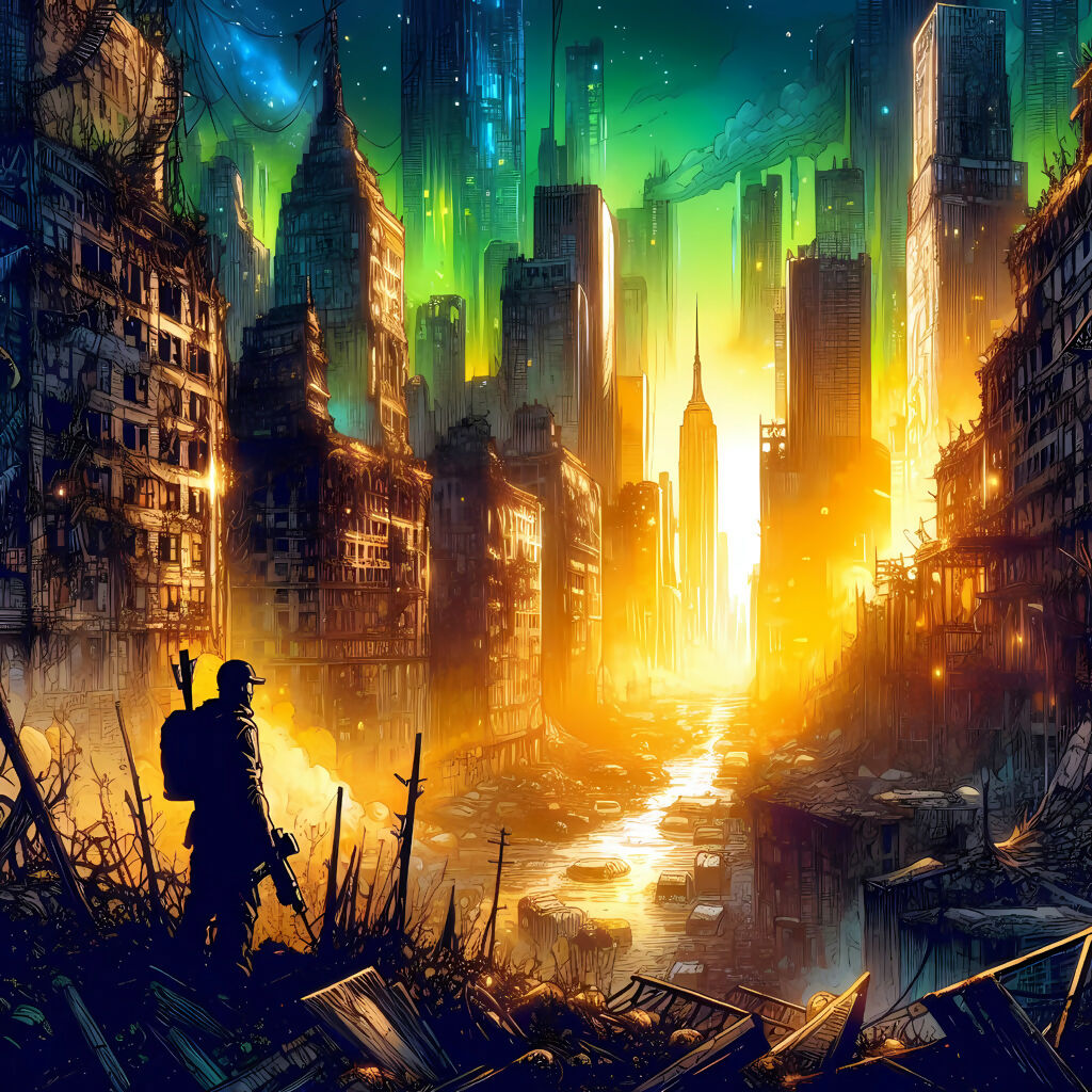 In a world where civilization has crumbled, Last Light Over Ruin captures the haunting beauty of survival amidst devastation. A lone figure stands armed and vigilant, silhouetted against the glowing horizon of a shattered metropolis. Crumbling skyscrapers, overgrown with nature’s reclaiming touch, stretch into a surreal sky lit by eerie green and orange hues. This AI-generated artwork evokes a powerful narrative of resilience, solitude, and the remnants of hope in a dystopian future. Perfect for collectors drawn to cinematic landscapes and emotionally charged storytelling.