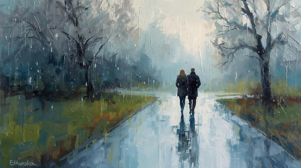 Nice abstract painting of a couple walking through the park on a rainy day.