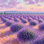 A serene beauty of a vast lavender field at sunset. It uses the Impressionist technique of short, visible brushstrokes and a pastel color palette to convey the play of light and shadow across the landscape. The sky is a blend of soft pinks, purples, and oranges, while the lavender flowers sway gently in the evening breeze.
