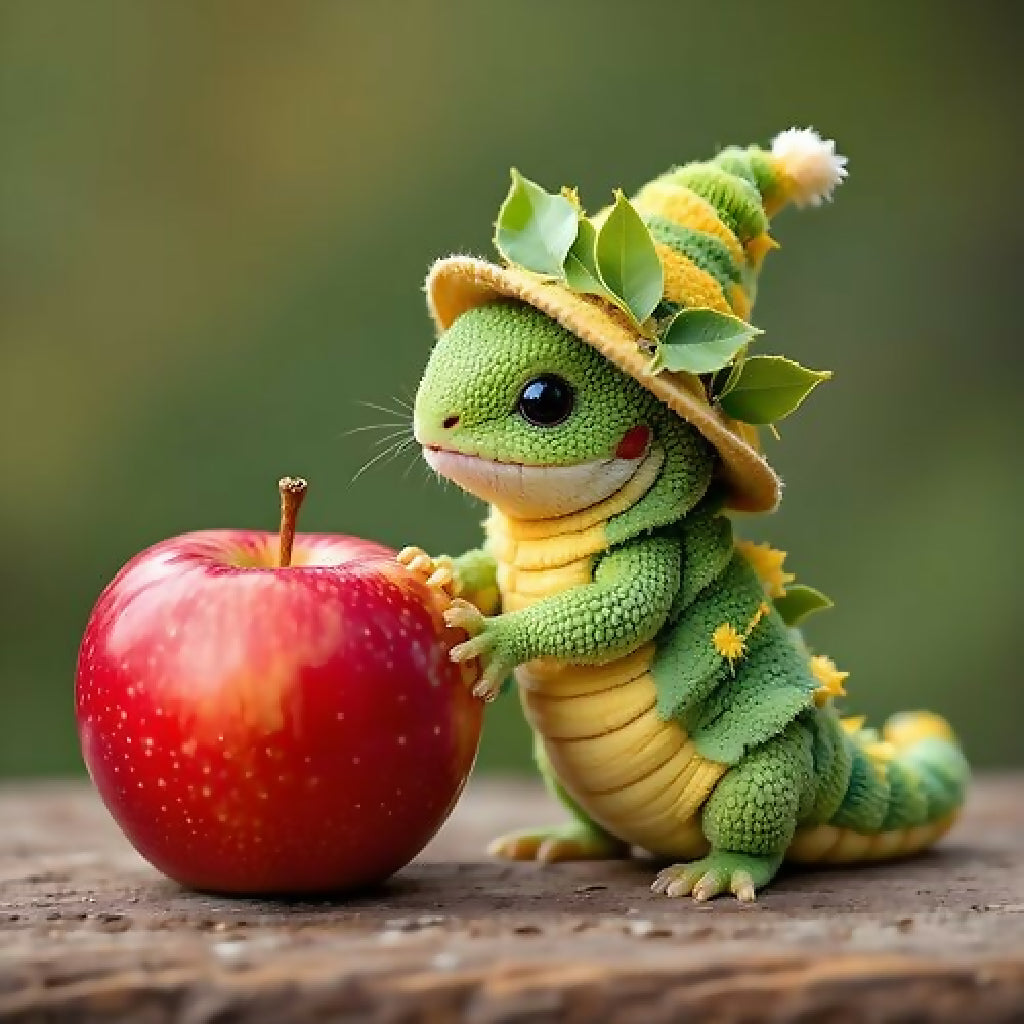 Un drôle de lézard vert avec un chapeau et une belle pomme rouge