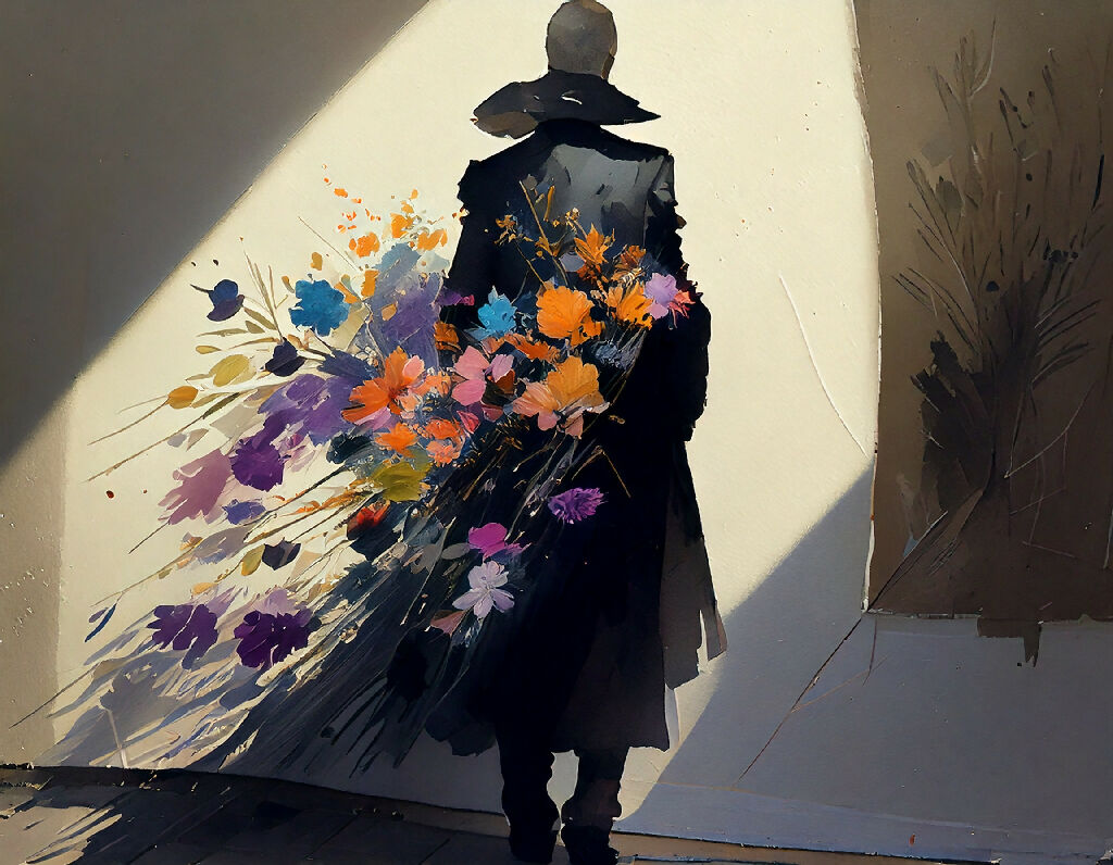 La silhouette d'un homme son manteau se transformant en trainée de fleurs