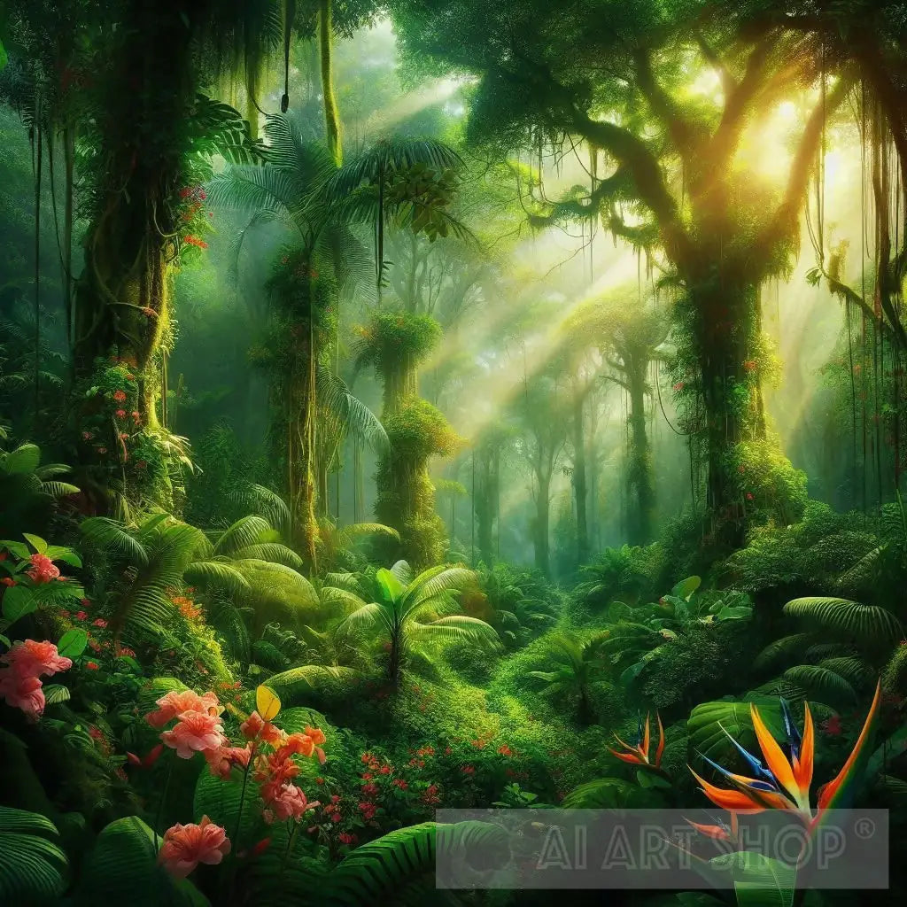 Towering above are the rainforest’s trees, their trunks like ancient pillars supporting a canopy that filters the sunlight into a soft, dappled glow. The canopy is a world unto itself, teeming with life from countless species of birds, insects, and other creatures that call the treetops home.