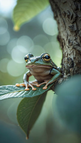 Step into the serene beauty of nature with this captivating AI-generated artwork featuring a peaceful frog resting on the lush green leaves of a tree. With its vibrant colors, intricate details, and calming ambiance, this masterpiece captures the essence of tranquility and harmony in the wild. The delicate balance between the frog and its natural surroundings creates a scene that evokes both relaxation and wonder.