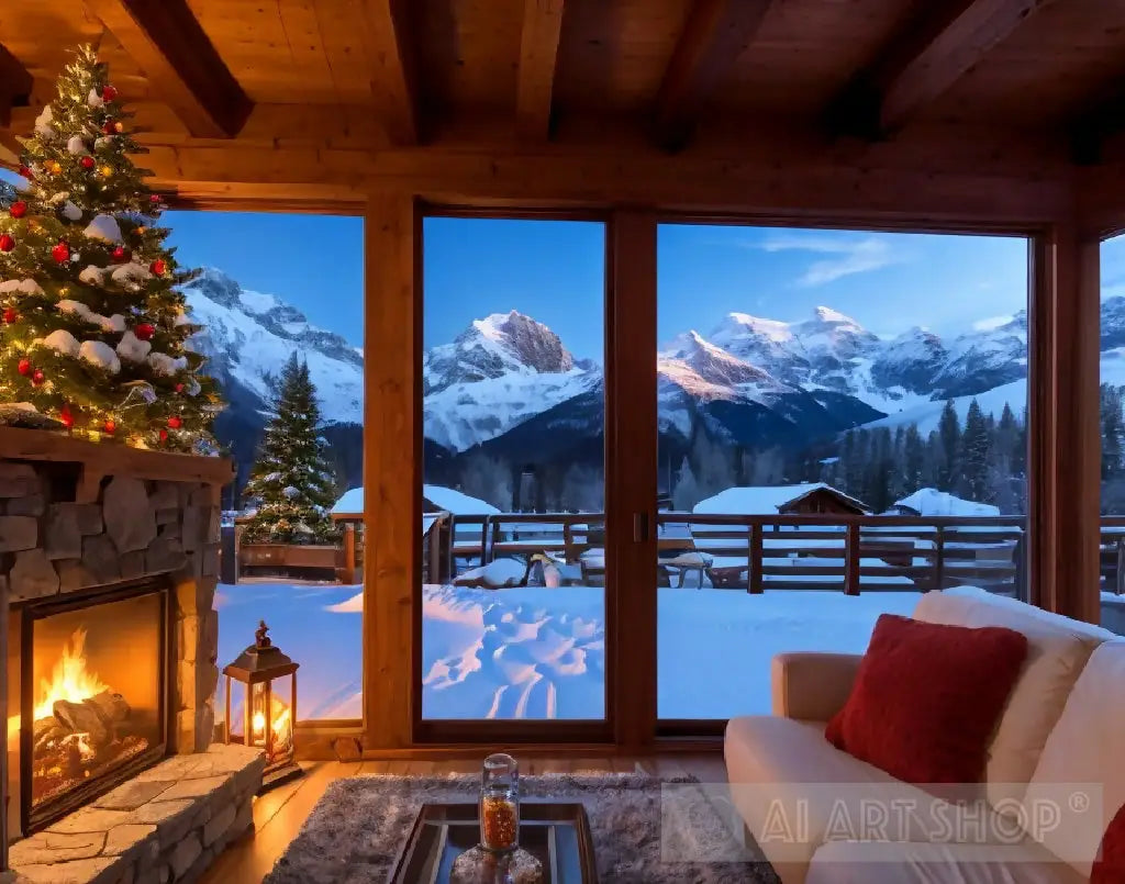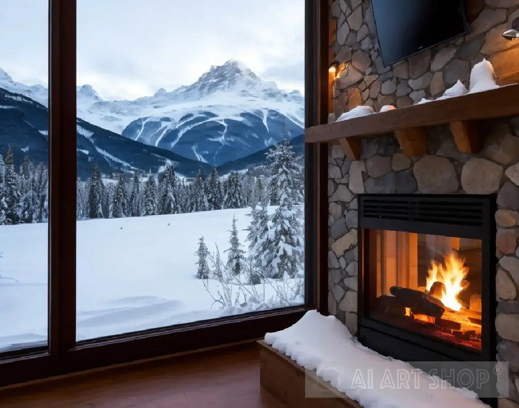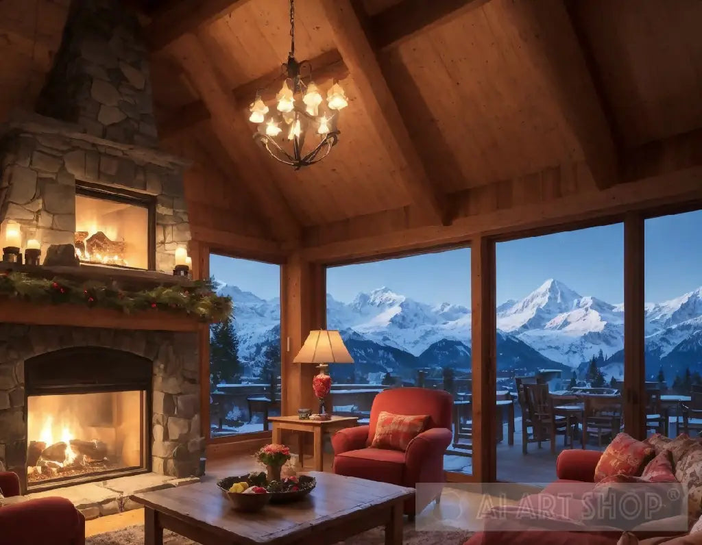 Inside a Swiss chalet, snow capped mountain view out of window,  with a fireplace, at night