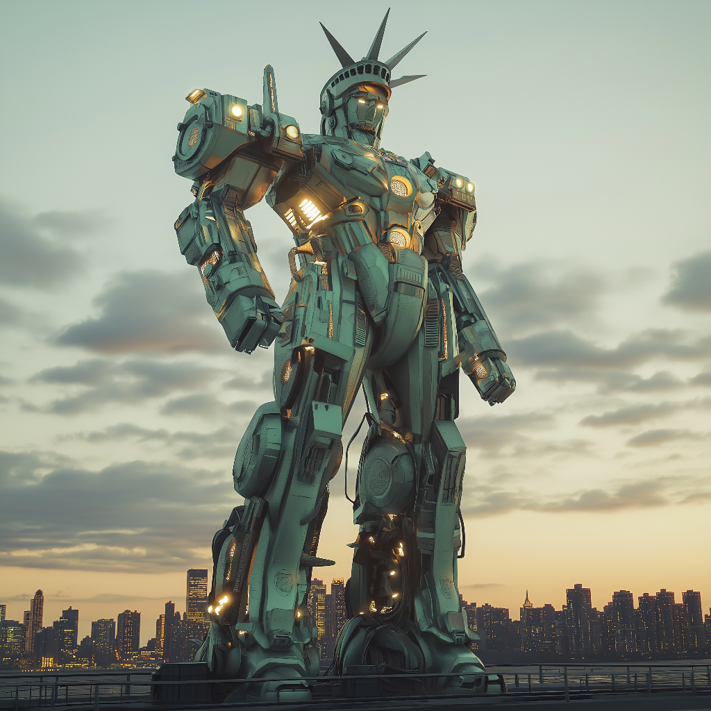 This AI-generated masterpiece reimagines the Statue of Liberty as a colossal, futuristic Gundam—a sentinel of freedom and innovation. Standing tall against a backdrop of a vivid cyberpunk skyline, the Liberty Gundam is an awe-inspiring fusion of neoclassical design and advanced robotics.