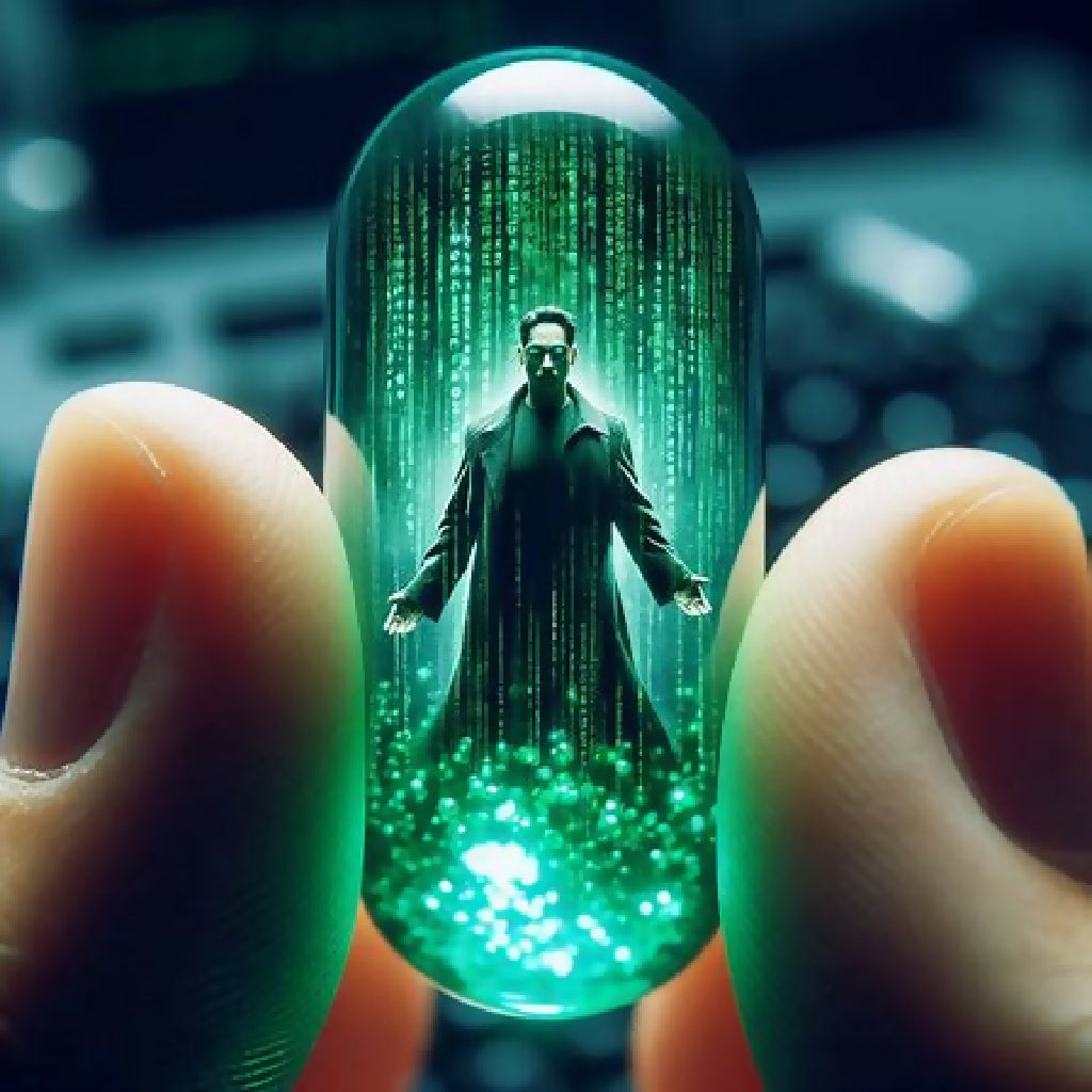 The image shows a close-up of two fingers holding a green capsule. Inside the capsule, there is a small figure of a person wearing a long coat, standing with arms slightly outstretched. The background inside the capsule features a digital matrix-like pattern with green code, reminiscent of the visual style from the movie "The Matrix." The capsule also contains small green particles at the bottom. This image is interesting because it combines elements of science fiction and digital culture, symbolizing themes of virtual reality and alternate realities.