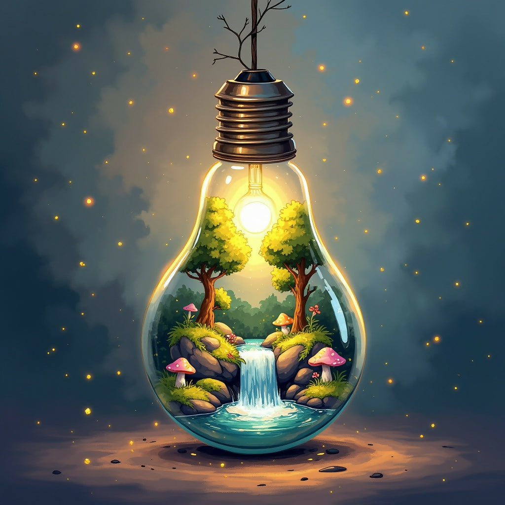 Around the waterfall, mist rises gently, adding an ethereal touch to the scene. The background is a dreamy mix of soft clouds and glowing ambient light, creating a sense of wonder and serenity. Perfect for lovers of surreal and creative art, this piece is a beautiful fusion of innovation, nature, and imagination.