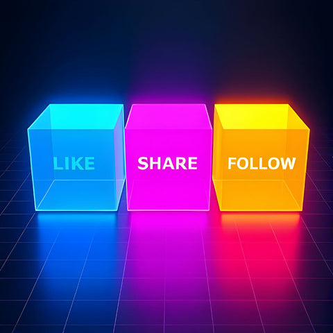 Three smooth, pastel-colored rectangular blocks (soft pink, mint green, sky blue) arranged neatly in a row on a clean white surface. "LIKE" is subtly embossed on the pink block, "SHARE" on the green, and "FOLLOW" on the blue in a clean sans-serif font. Soft, diffused overhead lighting creates minimal shadows. Shallow depth of field, focus sharp on the front faces. Minimalist aesthetic, high detail texture on blocks.