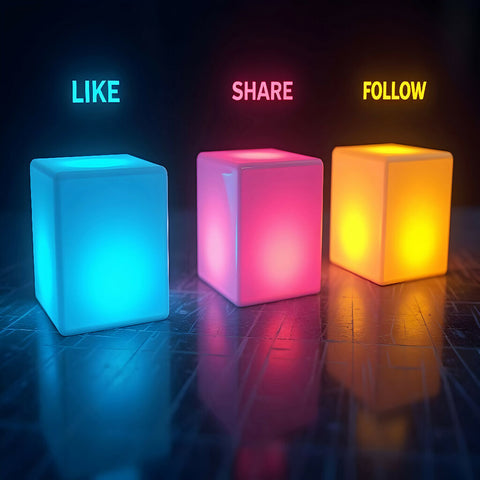 Three smooth, pastel-colored rectangular blocks (soft pink, mint green, sky blue) arranged neatly in a row on a clean white surface. "LIKE" is subtly embossed on the pink block, "SHARE" on the green, and "FOLLOW" on the blue in a clean sans-serif font. Soft, diffused overhead lighting creates minimal shadows. Shallow depth of field, focus sharp on the front faces. Minimalist aesthetic, high detail texture on blocks.