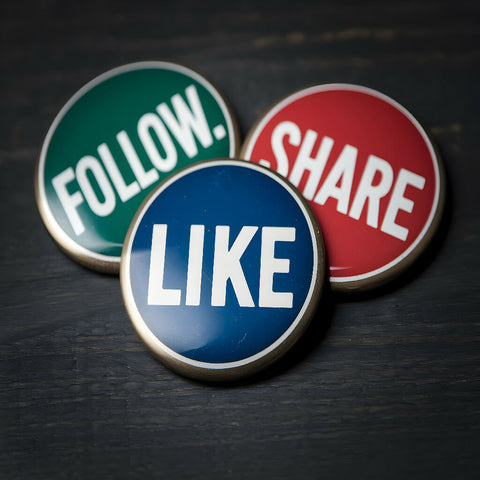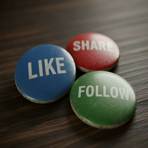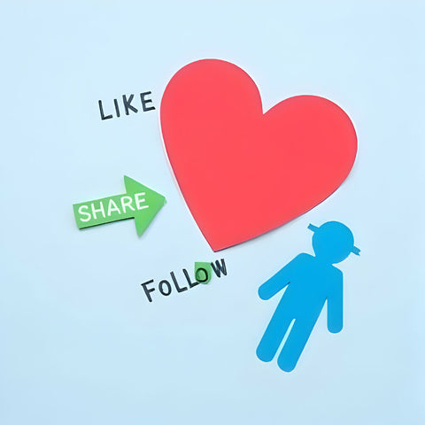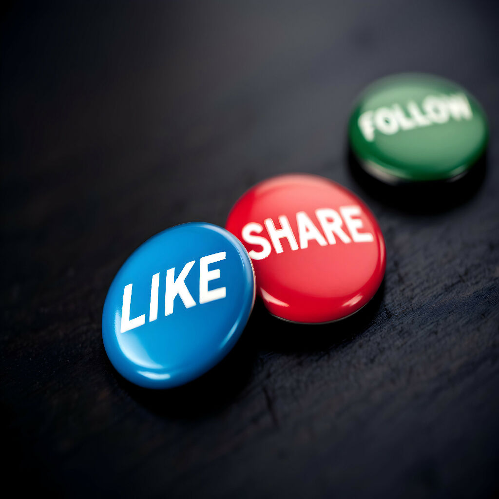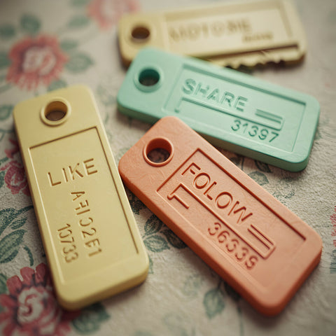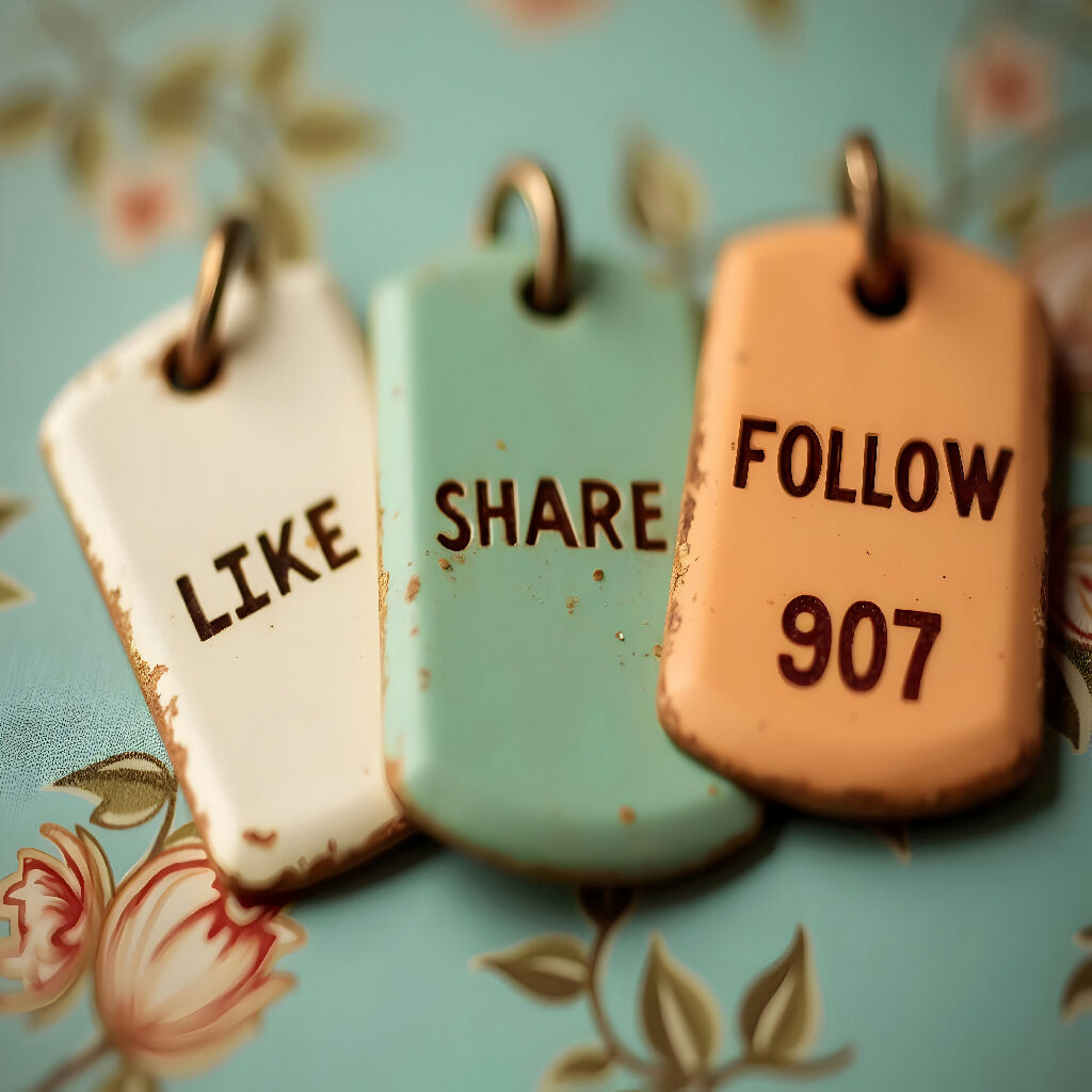 Three smooth, pastel-colored rectangular blocks (soft pink, mint green, sky blue) arranged neatly in a row on a clean white surface. "LIKE" is subtly embossed on the pink block, "SHARE" on the green, and "FOLLOW" on the blue in a clean sans-serif font. Soft, diffused overhead lighting creates minimal shadows. Shallow depth of field, focus sharp on the front faces. Minimalist aesthetic, high detail texture on blocks.