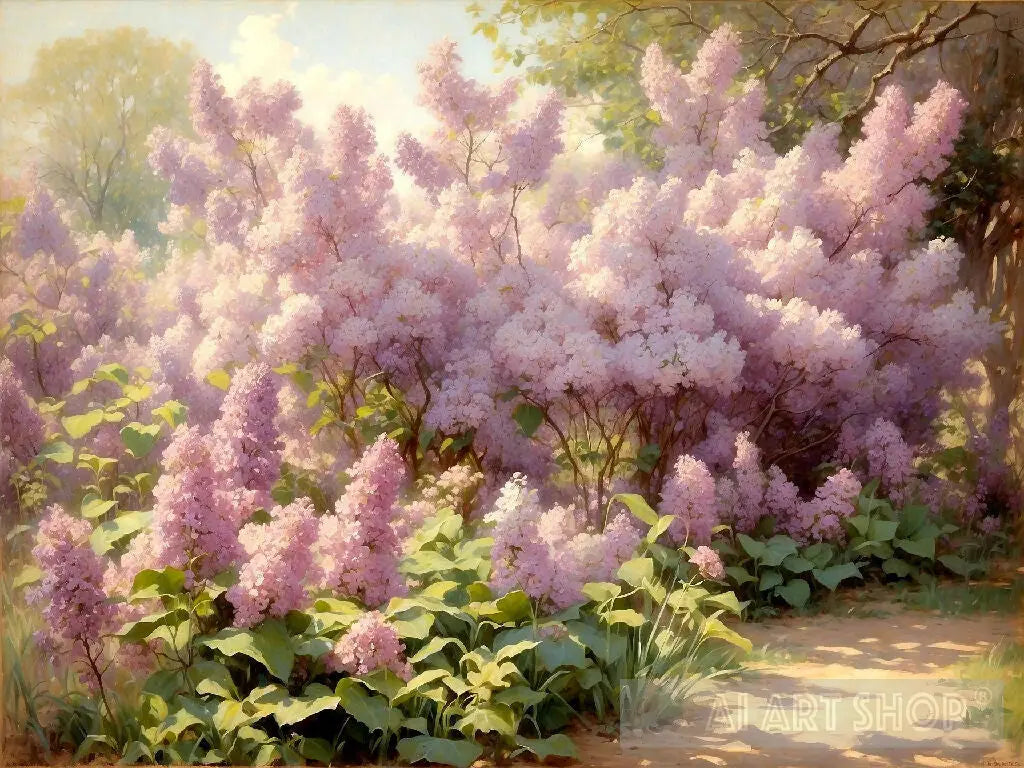 This painting features a garden in full bloom with lilac bushes bursting with color. The light filters through the delicate blossoms, casting gentle shadows on the ground. The use of pastel colors and soft brushstrokes perfectly captures the ephemeral beauty of spring.
