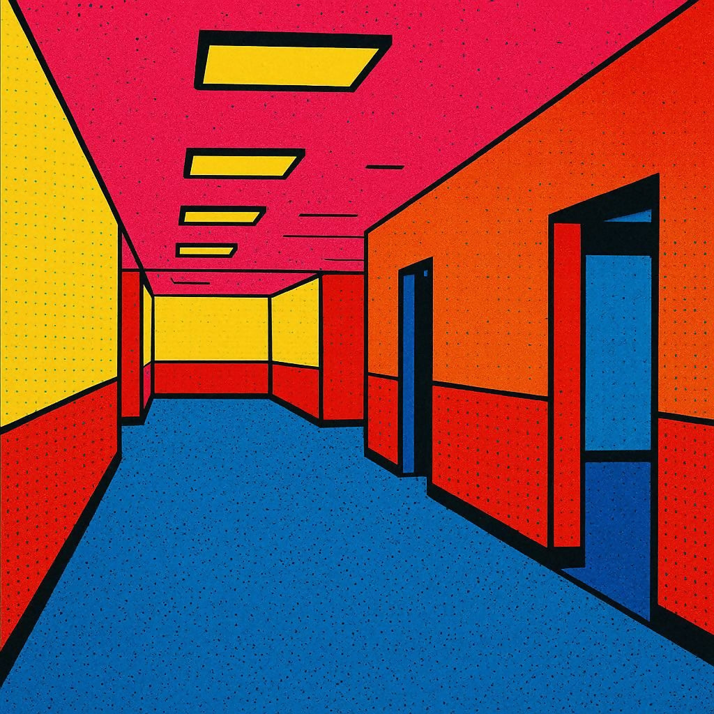 Step into the "in-between" with Liminal Litho, a striking piece of contemporary pop art that reimagines the eerie, familiar mystery of a liminal space. Featuring a never-ending hallway in bold primary colors, this design uses heavy black outlines and classic Ben-Day dots to create a high-contrast, comic-book aesthetic. Perfect for fans of weirdcoredreamcore, and minimalist architectural art.