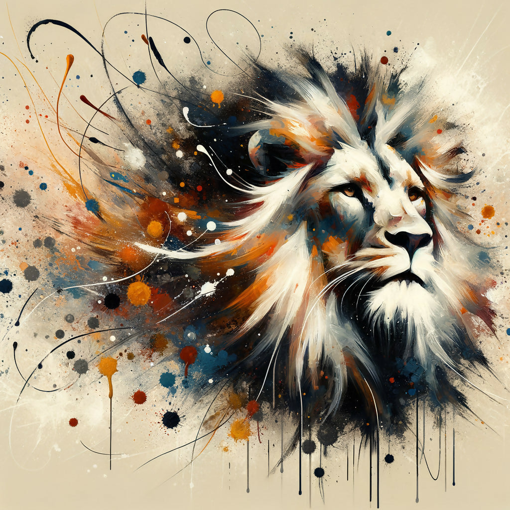 Vibrant abstract painting of a lion on canvas, exuding a mix of chaos and sophistication with oil paint splatters, reminiscent of 1920s splash art style.