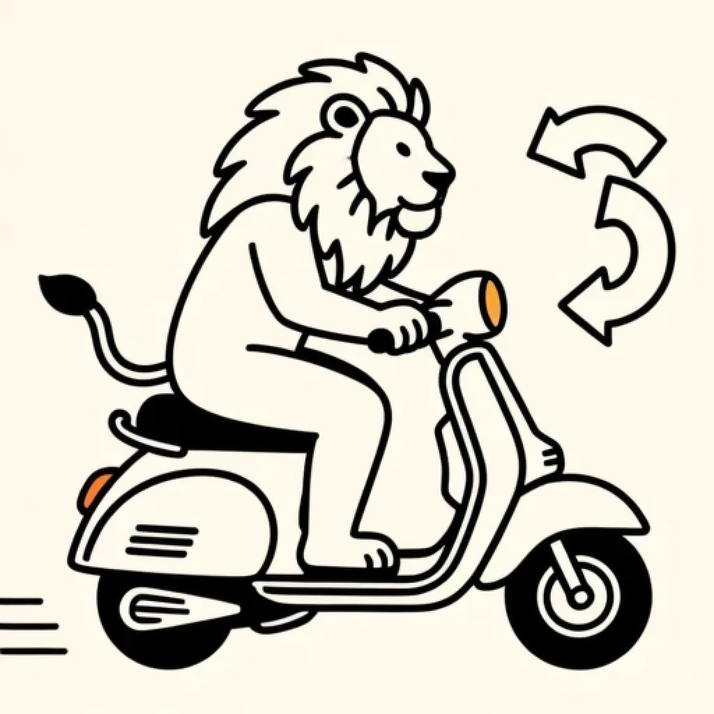 A playful lion zips through the scene on a stylized scooter, mane flowing and paws gripping the handlebars with confident flair. Motion lines trail behind the wheels, capturing the thrill of movement, while curved arrows above suggest a swift, spirited turn. Rendered in cartoon style, this black-and-white illustration blends humor with imagination—transforming the king of beasts into a creature of quirky charm and kinetic joy. Perfect for storytelling, children’s themes, or lighthearted branding, this piece celebrates courage, motion, and the unexpected delight of wild wheels.